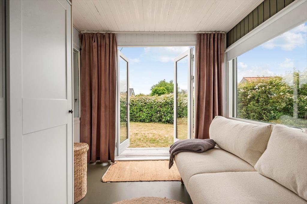 Når du træder indenfor, mødes du af en gennemført og stilfuld indretning, hvor lyse trævægge, bløde tekstiler og nøje udvalgte møbler skaber en varm og indbydende atmosfære. De store vinduespartier lader lyset strømme ind og forbinder ude og inde på en harmonisk måde, så du hele tiden har naturen som en del af oplevelsen.