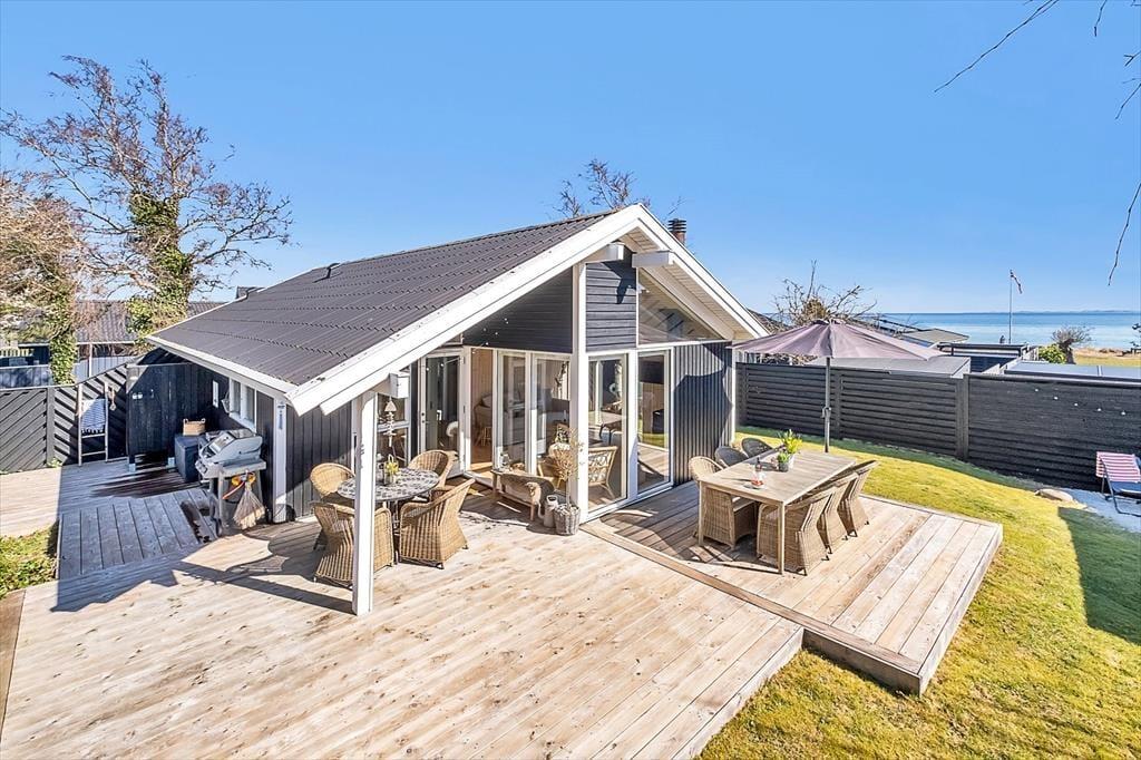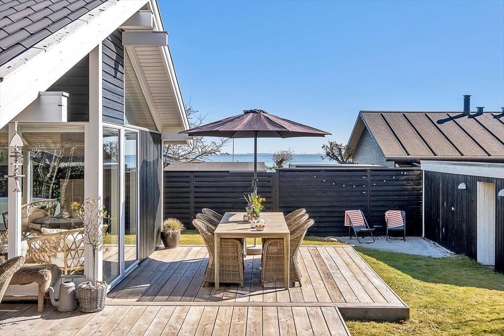 Det er udenfor, ferielivet folder sig ud i fuldt flor. Den store træterrasse inviterer til lange morgenmåltider i solen, eftermiddage med benene oppe og aftener med grill og gode snakke i skæret fra solnedgangen. Der er havemøbler, liggestole og parasol, så du altid kan finde den rette plads – uanset om du drømmer om sol på næsen eller skygge med et glas koldt i hånden. Efter en dukkert i havet er det skønt at kunne skylle sig under den udendørs bruser og mærke feriens frihed i kroppen. Den frodige have omkring huset indbyder til ro og afslapning – måske en middagslur i solen, måske en stille stund med fuglekvidder i baggrunden og duften af grill, der blander sig med den lune sommerluft. Her er det let at glemme tiden og bare være – præcis som man skal, når man holder ferie.