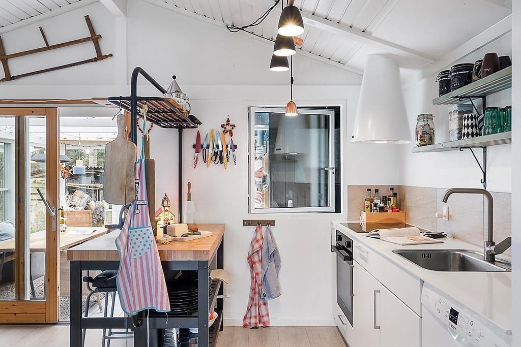 Når du træder indenfor i sommerhuset, mødes du af en lys og rummelig indretning, der indbyder til både hygge og samvær. Den åbne stue med brændeovn skaber en varm og hyggelig atmosfære, hvor du kan slappe af med en god bog eller se en film efter en aktiv dag i naturen. Den dejlige udestue fungerer som et ekstra opholdsrum og er perfekt til afslapning, uanset om du vil nyde en morgenkaffe, læse eller blot kigge ud på den store grund. Køkkenet er funktionelt og nemt at arbejde i, så feriemiddage kan tilberedes og nydes i det gode selskab.