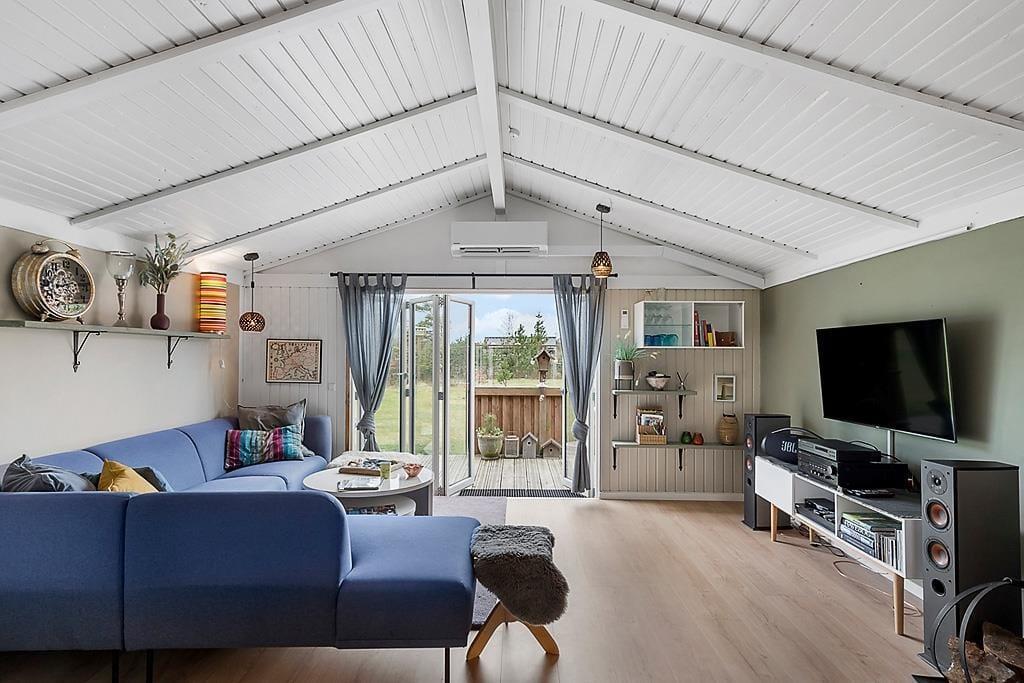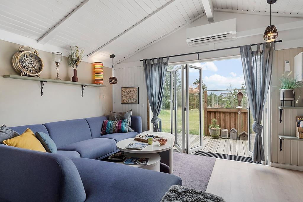 Sommerhusets store terrasse er et perfekt sted at tilbringe tid sammen med familie og venner. Her kan du sidde i solen og nyde den friske luft, eller trække dig tilbage til skyggen, hvis du foretrækker det. Den dejlige grund rundt om huset giver både plads til leg og afslapning, og det er let at finde en stille plet til at slappe af i. Om aftenen kan du tænde grillen og nyde et lækkert måltid udendørs, mens du ser solen gå ned. Den hyggelige udestue er et ekstra plus, når du ønsker at tilbringe tid udenfor på en lidt køligere dag.