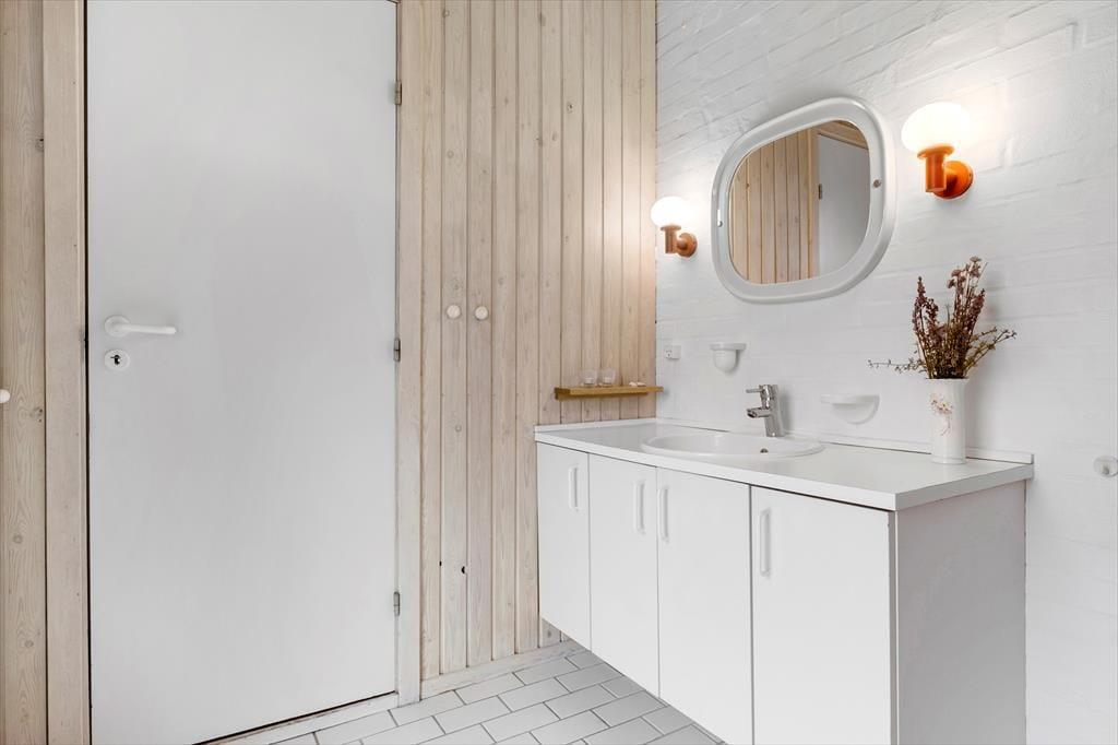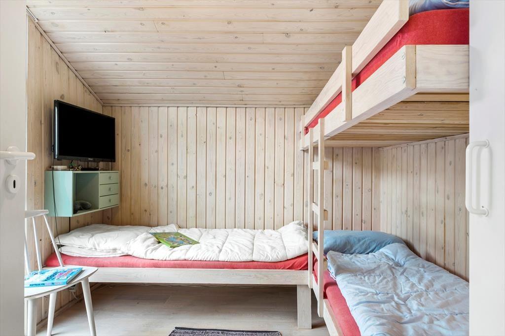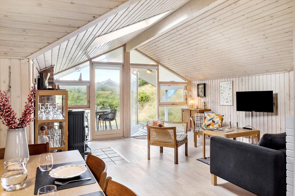 Den gode sommerhusstemning kan blandt andet mærkes i opholdsrummet, hvor køkken og stue er forenet. Det er et skønt sted at samles hele familien, for eksempel med ild i brændeovnen, varm kakao i kopperne og brætspil på sofabordet. Eller I kan tage et spil bordfodbold, som også forefindes i huset. I løbet af dagen kan I nyde det gode indfaldslys, som rummets store vinduer giver, og når I kigger ud på de naturskønne omgivelser, kan det sagtens være, at I ser råvildt trippe forbi i nærheden. Sommerhusets praktiske planløsning byder desuden på et pænt badeværelse og tre soveværelser, der alle er lyse og velholdte rum.