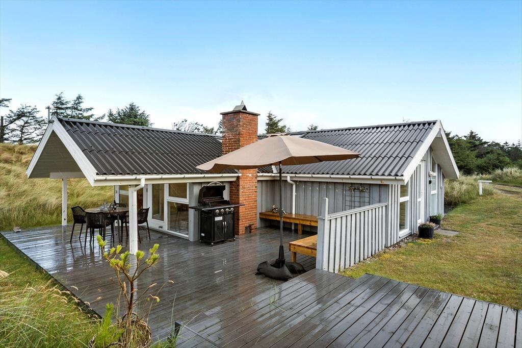 Her på Vandrebakken i Saltum finder I indbegrebet af et klassisk dansk sommerhus – med træfacade og solterrasser, hyggelige soveværelser, brændeovn i stuen og en naturskøn placering nær Vesterhavet.