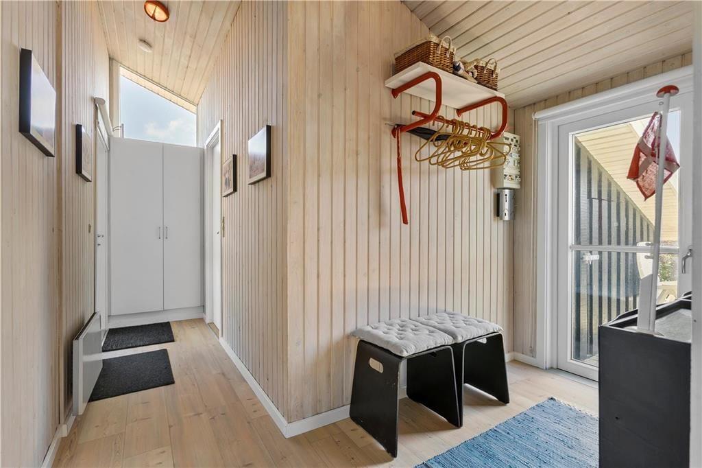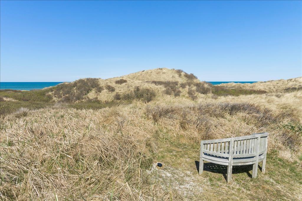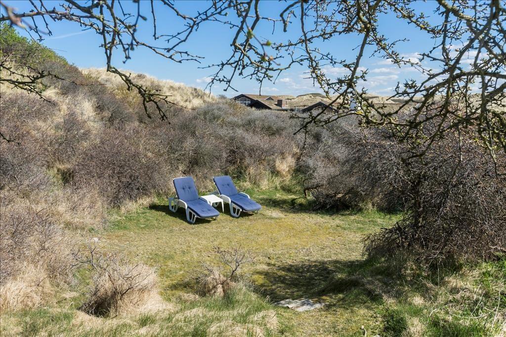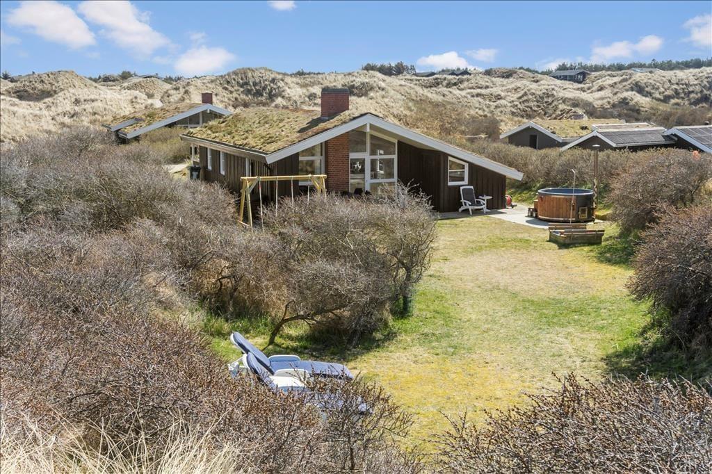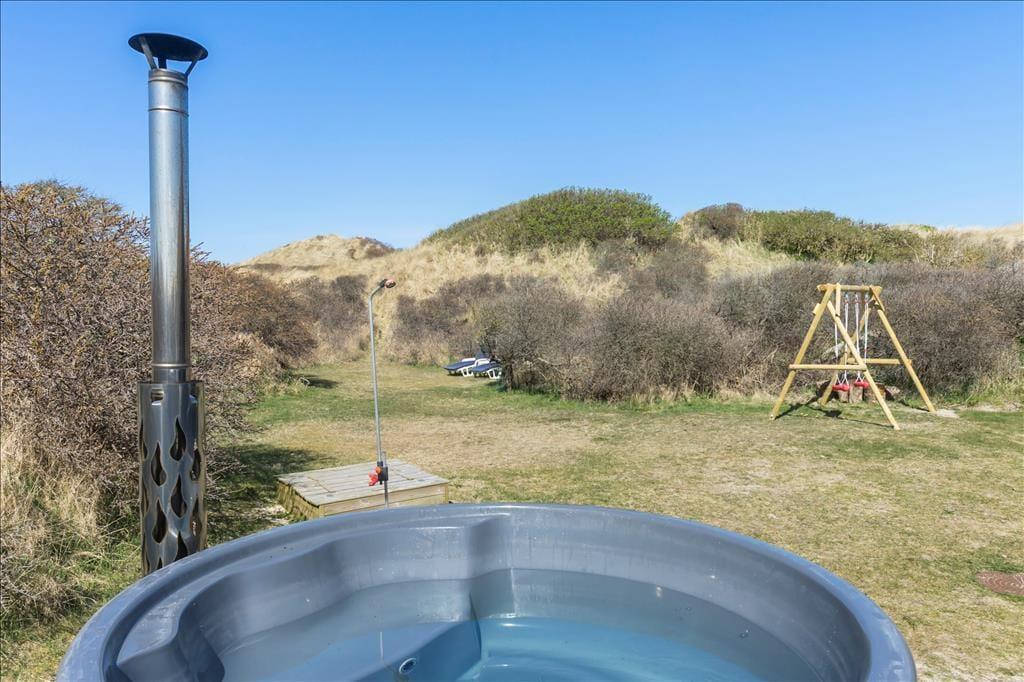 Udenfor venter en oase af ro og natur. Den store terrasse er udstyret med et vildmarksbad, som indbyder til afslapning under åben himmel, mens du nyder den friske luft og den omkringliggende natur. Det er den perfekte måde at afslutte en dag med strandbesøg eller vandreture i området. Den rummelige terrasse giver også mulighed for at samles til måltider på sommerdage, og den rolige beliggenhed sikrer, at du kan nyde dine måltider i fuldkommen fred. Her kan du tage det hele ind og virkelig mærke, hvordan stressen fra hverdagen forsvinder.