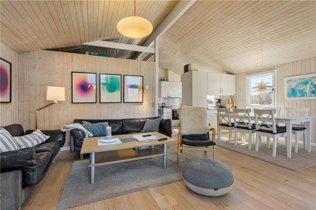 Når du træder indenfor i dette charmerende sommerhus, mødes du af en varm og indbydende atmosfære. Stuen er et perfekt sted at samles med dem, du holder af, hvor den knitrende brændeovn skaber en hyggelig stemning på de køligere dage. De store vinduespartier bringer naturen indenfor, og lyset fylder rummet med en behagelig varme. Det åbne køkken er ideelt til fælles madlavning, og det smagfulde møblement giver en følelse af luksus og komfort. Fra stuen er der direkte adgang til den skønne terrasse, hvor du kan fortsætte ferien i fredelige omgivelser.