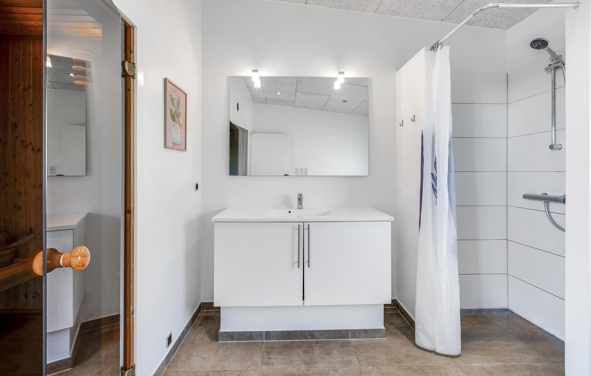 Dette rummelige sommerhus ligger i et område med en dejlig sandstrand og byder på mange aktivitetsmuligheder. Her findes nemlig et aktivitetsrum med mulighed for at vise jeres færdigheder i bordtennis, pool og bordfodbold. Bagefter kan I slappe af i det dejlige to-personers spabad eller nyde varmen fra den knitrende brændeovn. Soveværelserne er placeret, så de ikke ligger op mod hinanden. Udenfor finder I et udespa til 6 personer, hvor I kan nyde skøn ferieafslapning i det fri.