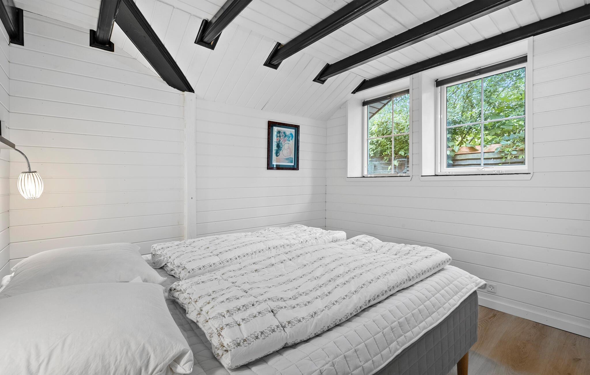 Det emmer af fred, ro og feriestemning i dette skønne sommerhus, som er lyst og åbent indrettet. Huset har flere fine detaljer, ikke mindst de opmalede sorte bjælker, som fremhæver arkitekturen. Her kan I slappe af mellem dagens udflugter, nyde livet og fylde timerne med madlavning, brætspil, gode bøger og ild i brændeovnen.