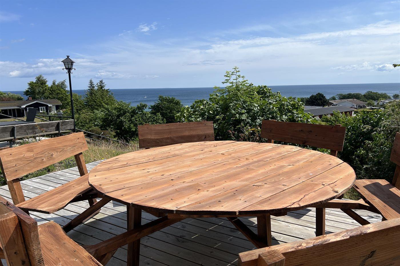 Fantastisk udsigt ud over Østersøen og det nordbornholmske, flotte kuperede landskab i Sandkås får man fra den store terrasse ved dette hus. Ønsker man lidt mere fred og ro, så kan gårdterrassen benyttes. Huset ligger sammen med andre lejligheder i det lille feriekompleks Kilden, der nok er fra 1919, men efter en smagfuld renovering fremstår huset i dag fuldstændig moderne og velfungerende.