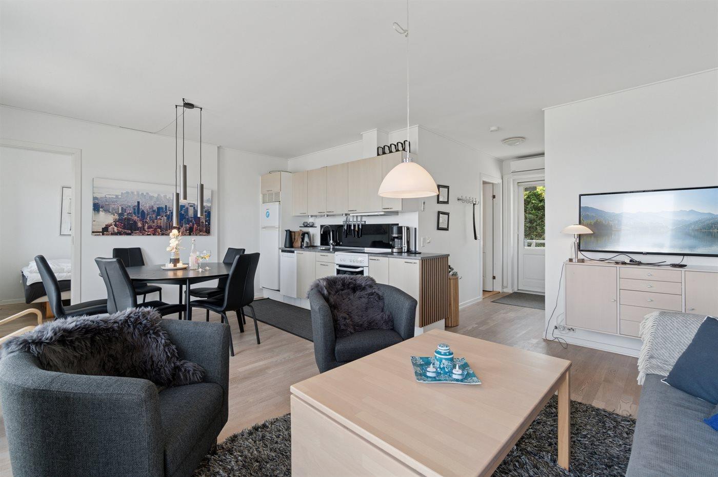 I den lyse stue finder man en virkelig behagelig og moderne skandinavisk møblering og en indbydende køkkenafdeling, så ferien kan nydes i fulde drag i en behagelig atmosfære med gode venner eller i den lille børnefamilie. To soveværelser - det ene med flot udsigt til vandet - begge med gode senge. Badeværelset er lyst og væggene er beklædt med hvide fliser.