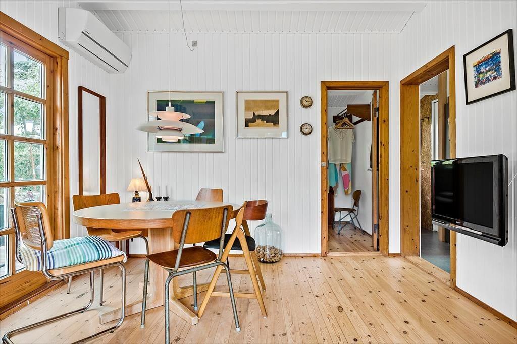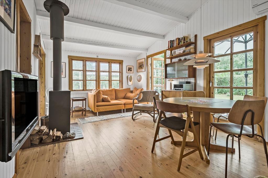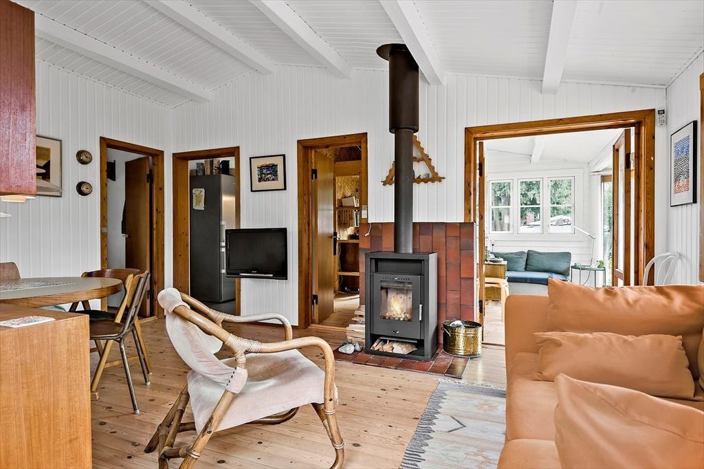 Stue med spisebord, sofa, TV og WIFI og varmepumpe og brændeovn. Fra stuen er der udgang til dejlig træterrasse som går rundt om hjørnet og hen ad langsiden på huset. Fra stuen er der også udgang til en lille udestue med skønt lys og en siddeplads, herfra kan man også gå ud på træterrassen.