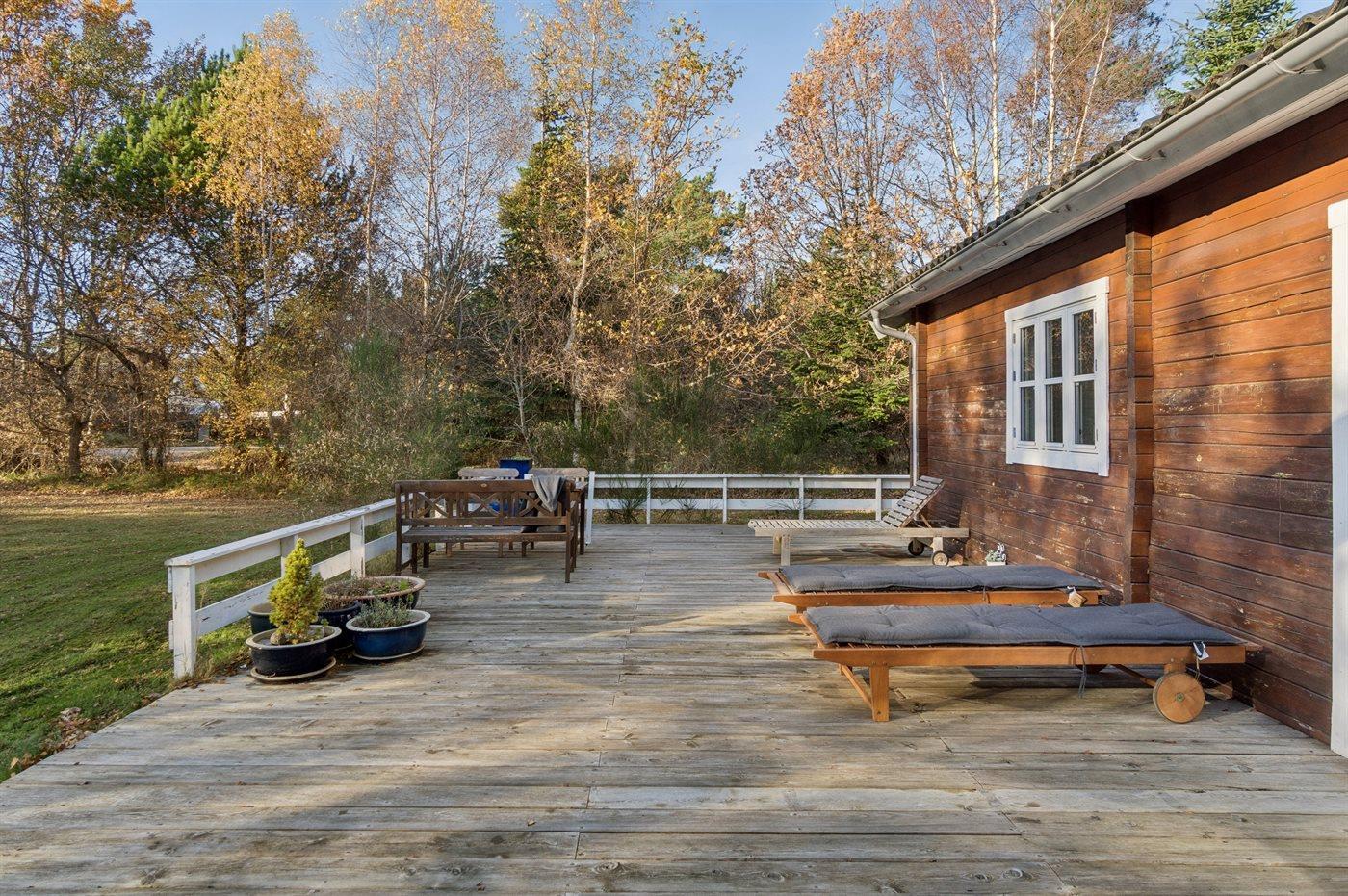 På den store træterrasse kan I slappe af og nyde det gode vejr og under den overdækkede del er der mulighed for skygge og for at tilbringe de sene aftentimer.