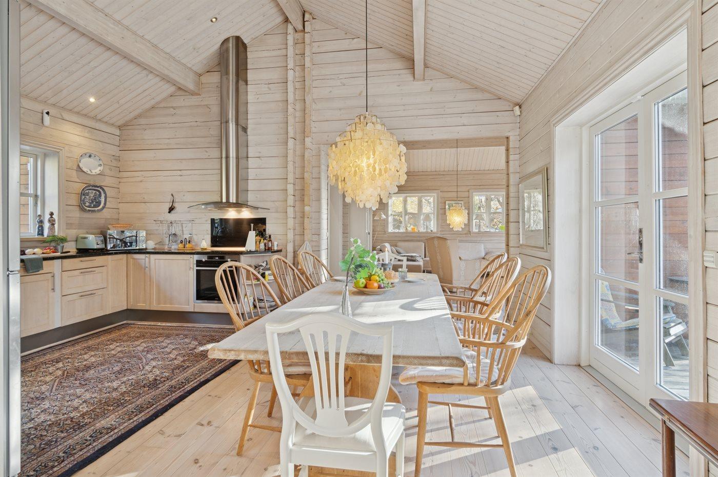 I dette fantastiske sommerhus kan I nyde ferien med højt til himlen og så sandelig også højt til loftet. Der er loft til kip i hele huset - med op til 4 meter til loftet. Der er masser af lys og luft i dette dejlige og lyse bjælkehus opført i kvalitetsmaterialer. Det store køkkenalrum med masser af plads og kombineret med stuen giver mulighed for hyggeligt samvær med familie og venner. Der er tillige klaver.
