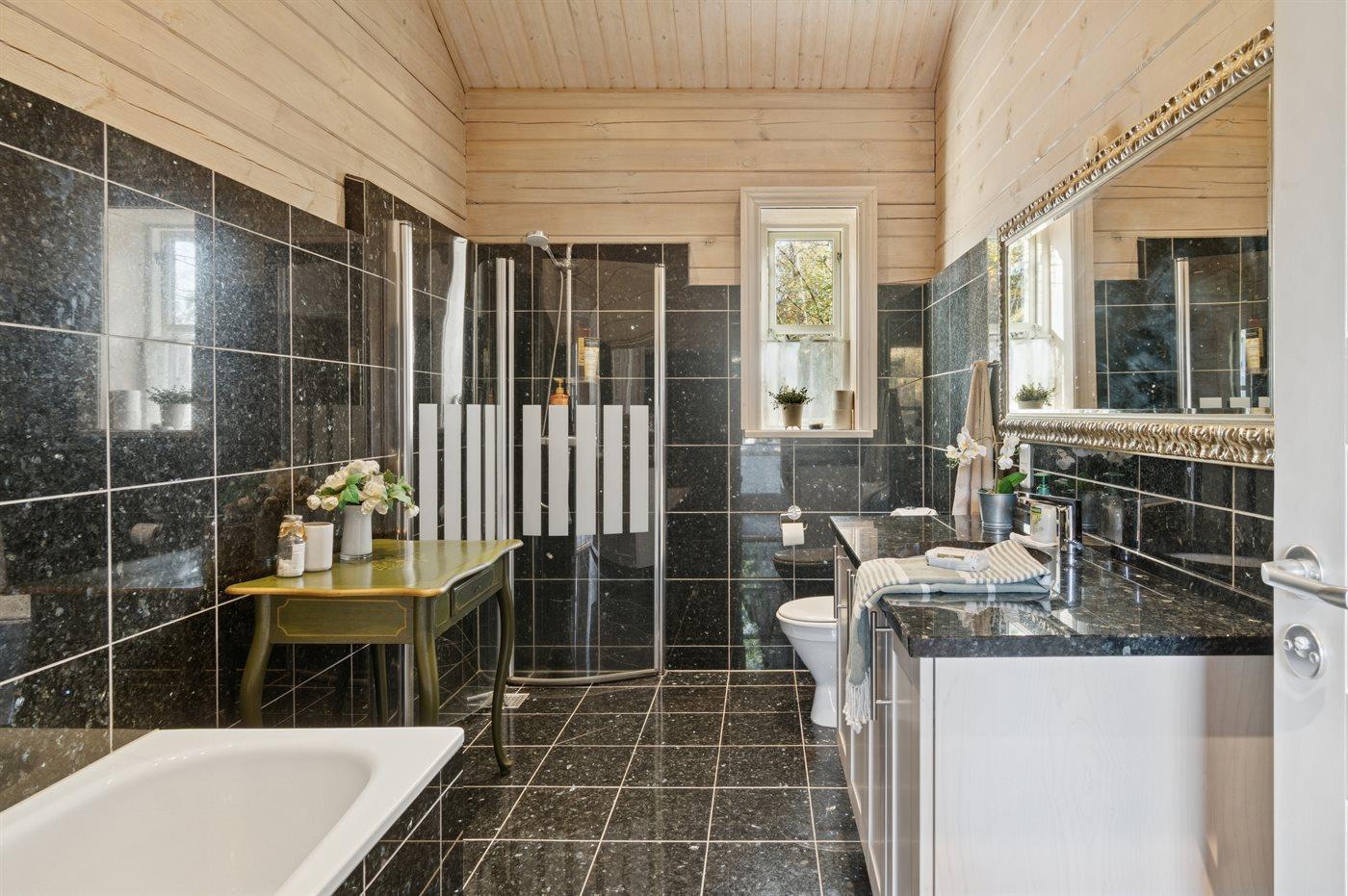 Der er 1 badeværelse med gulvvarme, badekar og bruseniche samt 1 badeværelse med gulvvarme og bruseniche.