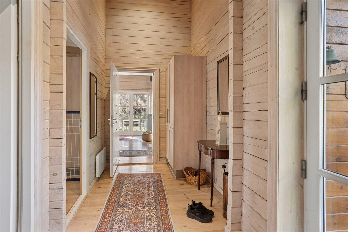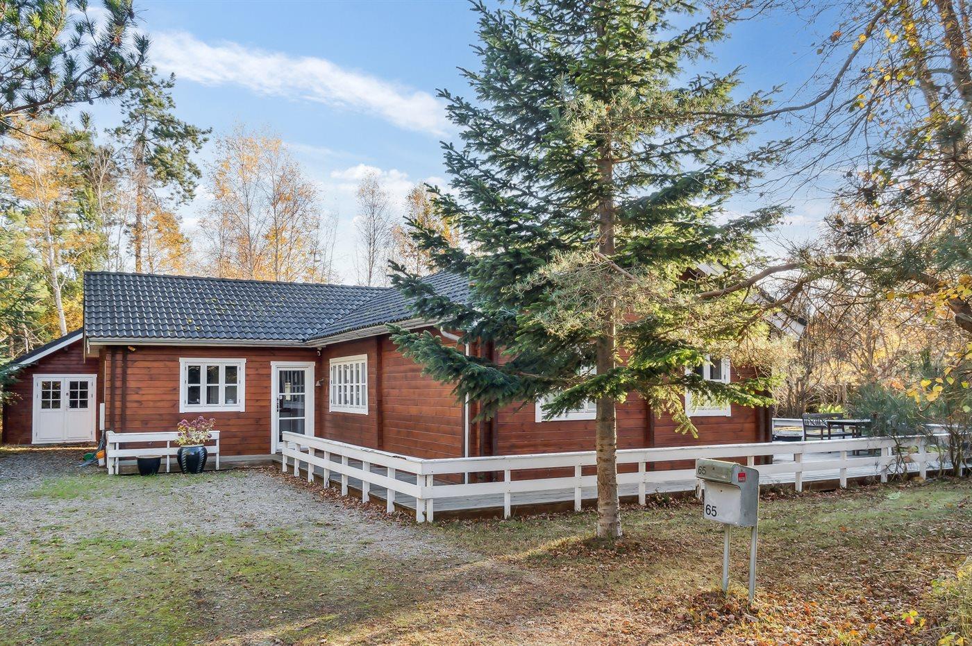 Lyst bjælkehus nær børnevenlig strand