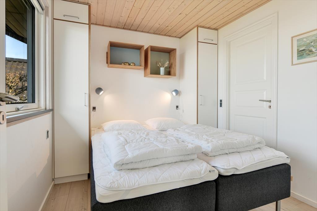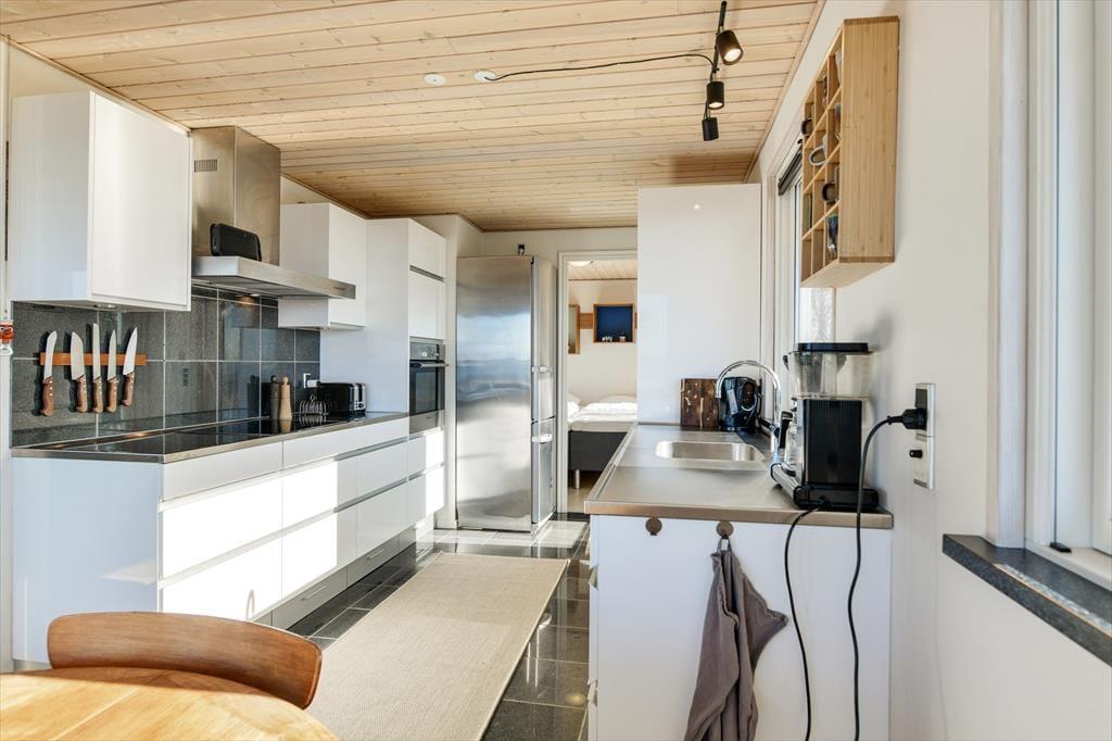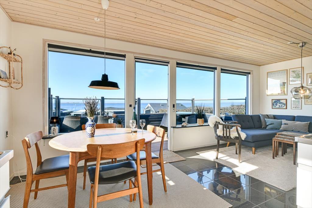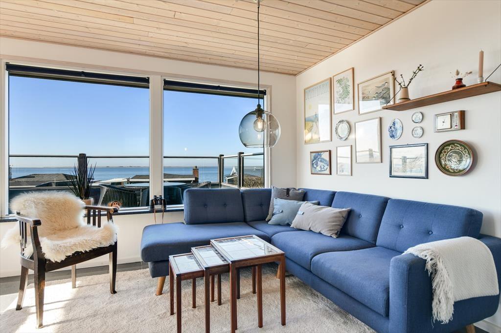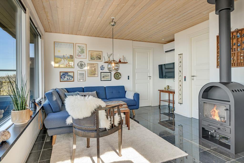 Allerede når du træder ind i sommerhuset, mødes du af en lys og venlig atmosfære. Indretningen er gennemtænkt og harmonisk, og rummene fremstår både indbydende og praktiske, så du kan føle dig hjemme fra første øjeblik. Store vinduespartier sørger for, at dagslyset strømmer ind og forbinder dig med naturens skiften udenfor. Og netop udsigten spiller en helt særlig rolle her – selv fra sofaen kan du lade blikket vandre ud over vandet og lade tankerne flyve i takt med mågerne. Du kan også tænde op i brændeovnen og nyde varmen og flammernes spil, mens du læser en god bog. Alt i huset emmer af kvalitet og komfort, så du har de bedste rammer for både afslapning og hyggelige stunder med dem, du holder af.