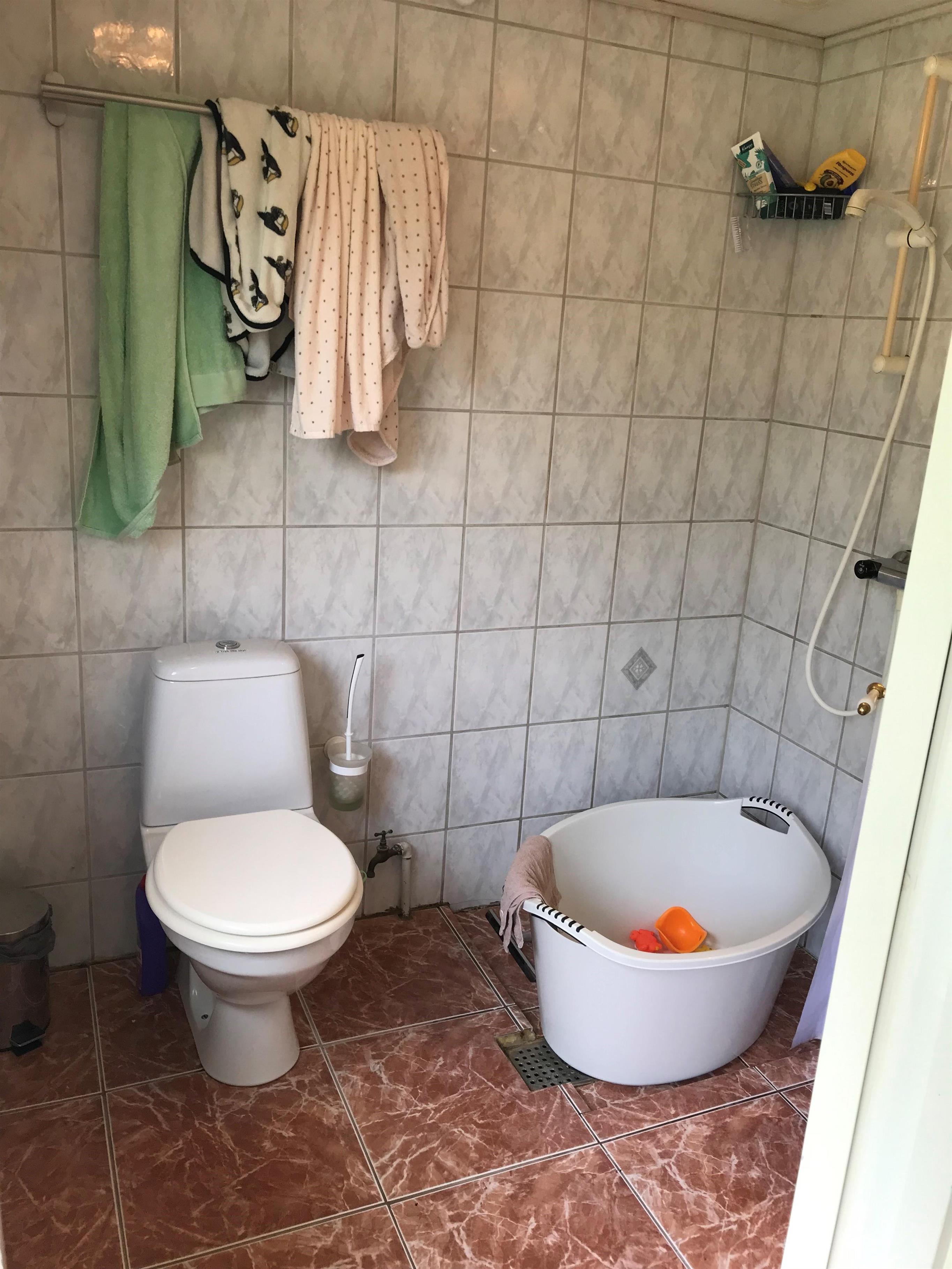 Huset har 2 badeværelser - et i hovedhuset og et i annekset med dobbeltseng. I begge badeværelser er der et toilet og brusebad. I det ene anneks er der også en vaskemaskine.