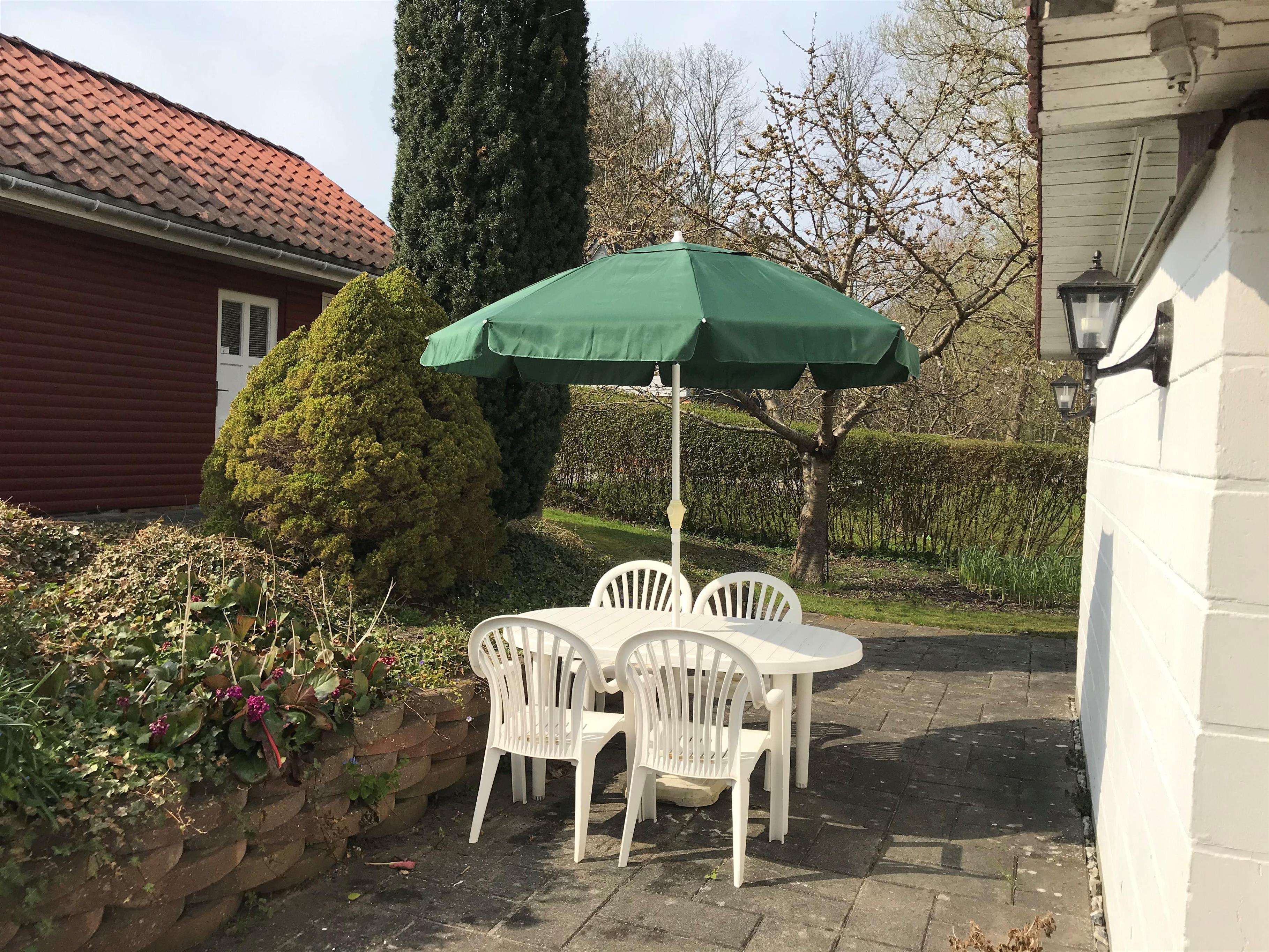 Huset ligger på en dejlig, stor grund med en skøn overdækket terrasse, hvor man både kan nyde solen og samtidig være i læ. Hvis det er køligt, er det muligt at dække terrassen af med baldakiner med vinduer, så lysindfaldet bevares. Der er rig mulighed for at grille, da der er en stor, ny gasgrill til rådighed.