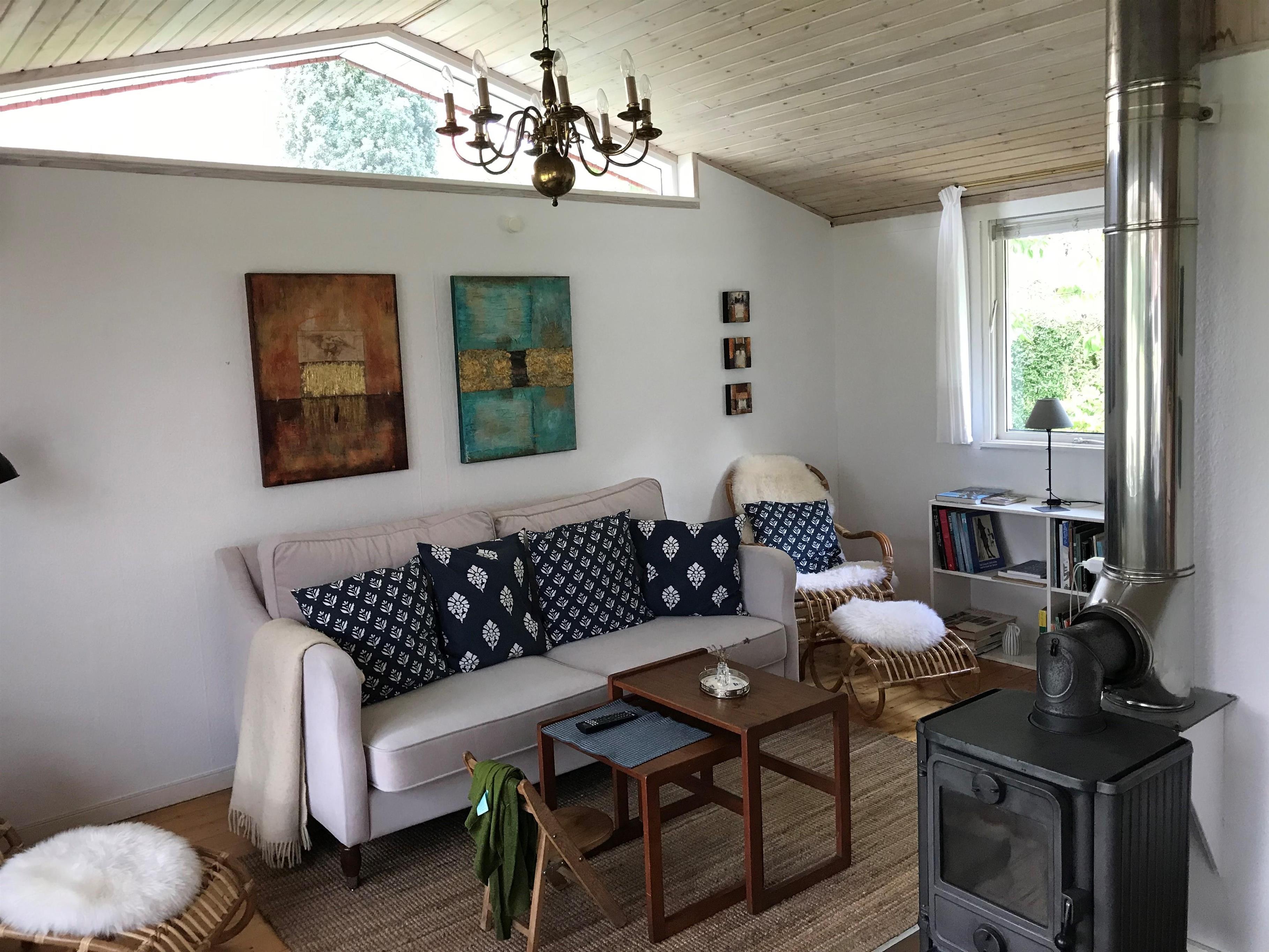 Ferieboligen består af 3 bygninger - en hovedbygning og to annekser. I hovedhuset er der et dejligt køkken i åben forbindelse med stuen, der har brændeovn og også Chromecast tv, som er nemt at benytte. Huset har også en varmepumpe. Der er opvaskemaskine, og i skuret er der en stor kummefryser på 300 l.