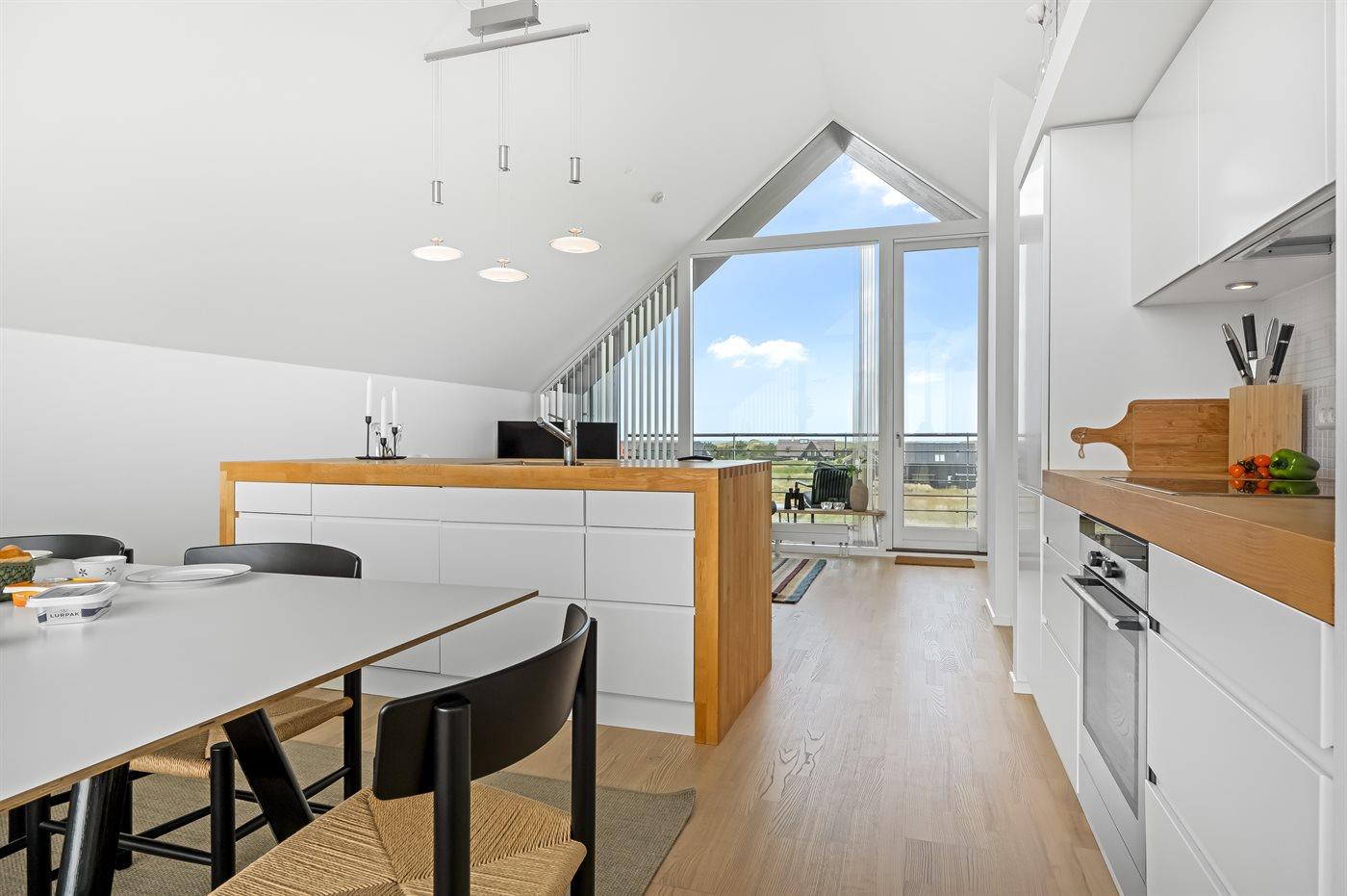 Køkkenet er udstyret med 1 køleskab. Der er 4 induktionskogeplader, varmluftovn samt opvaskemaskine.