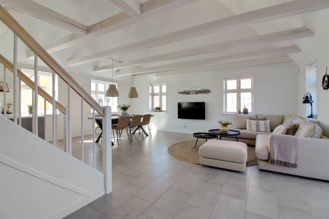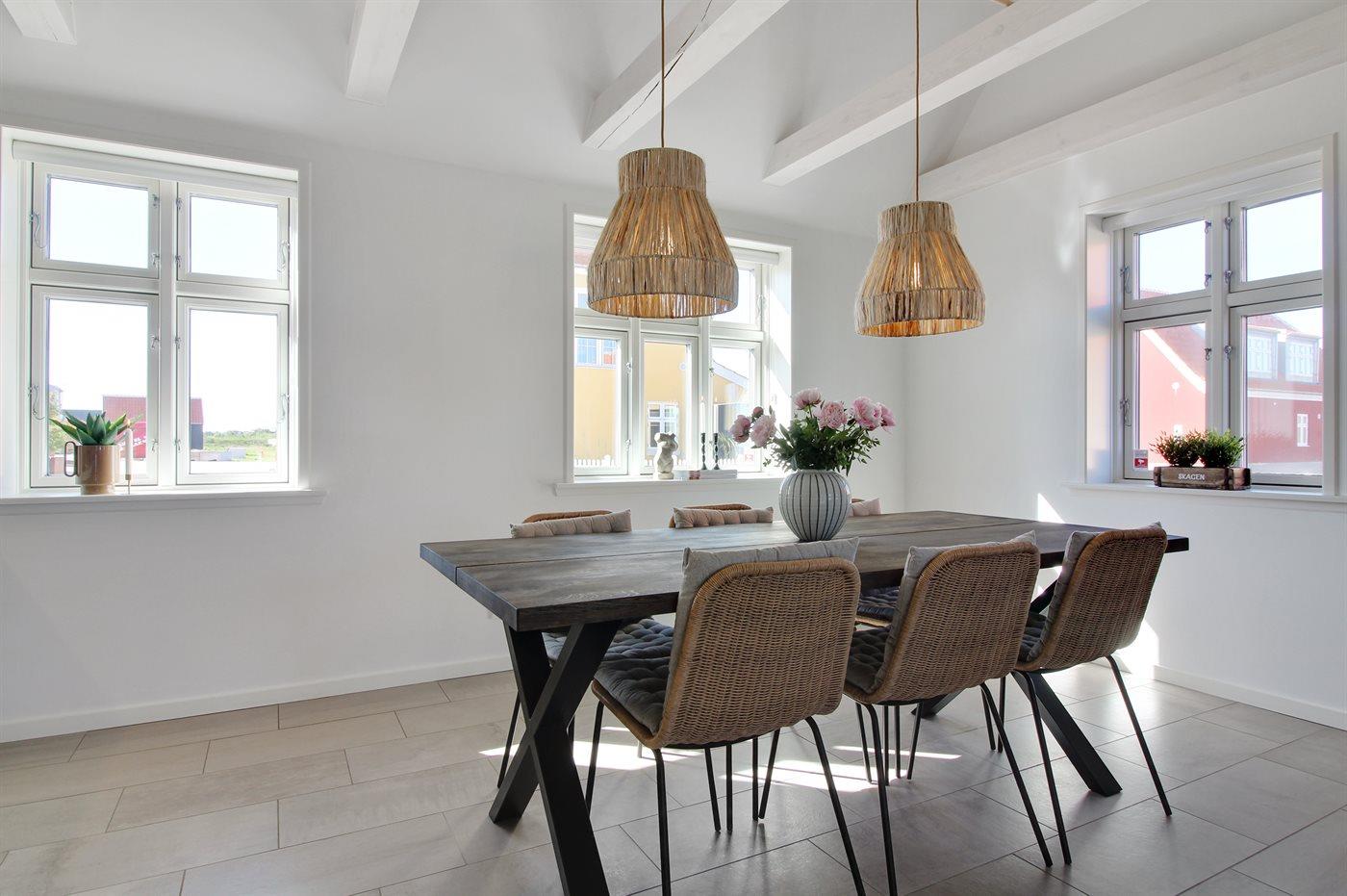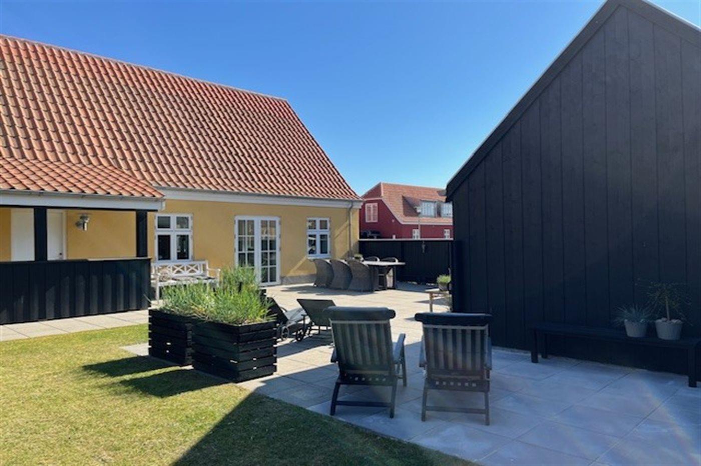 Oplev et moderne skagenshus med indhegnet grund og kort afstand til strand, havn og centrum i Skagen.