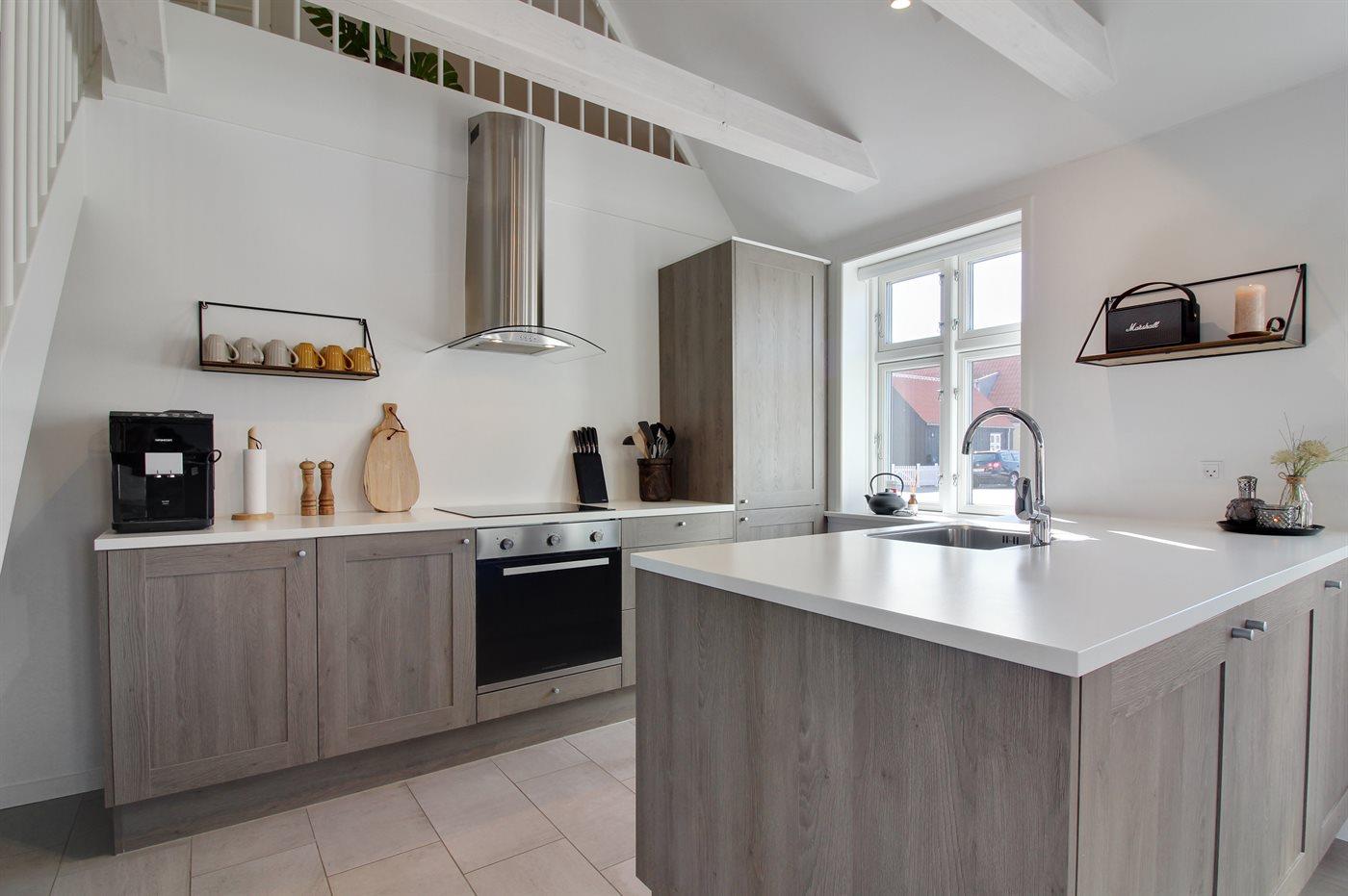 Køkkenet er udstyret med 1 køleskab. Der er 4 induktionskogeplader, varmluftovn samt opvaskemaskine.