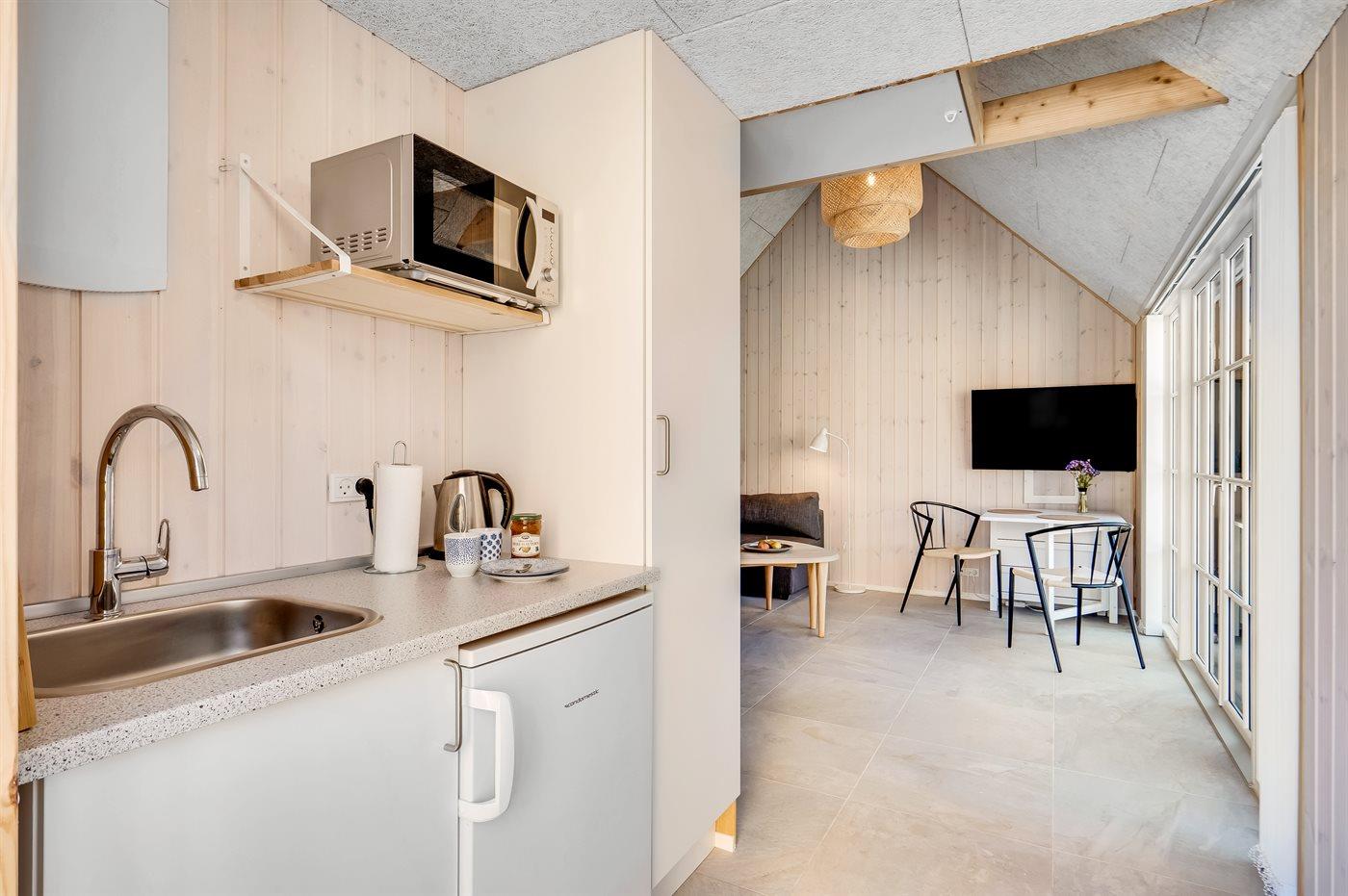 Køkkenerne er veludstyrede med i alt 2 køleskabe, 5 induktionskogeplader, varmluftovn, 2 mikrobølgeovne samt opvaskemaskine. Frysekapacitet på 60 liter, og der er opsat bæredygtig affaldssortering.