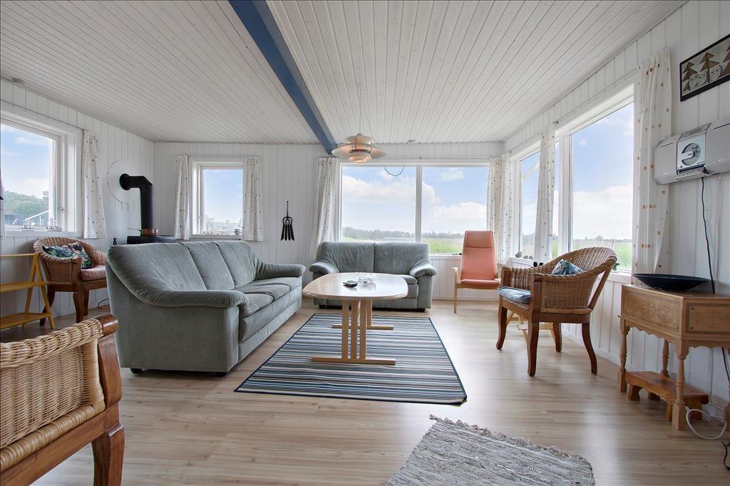 Fra entreen træder man ind i den ene af sommerhusets to stuer. Her er spiseplads og en skøn udsigt til terrassen og haven. Det store og hyggelige køkken er veludstyret og ligesom husets største stue, er der også her en fantastisk panoramaudsigt over Vesterhavet. Huset har 4 soveværelser og et badeværelse med en dejlig stor brusekabine.