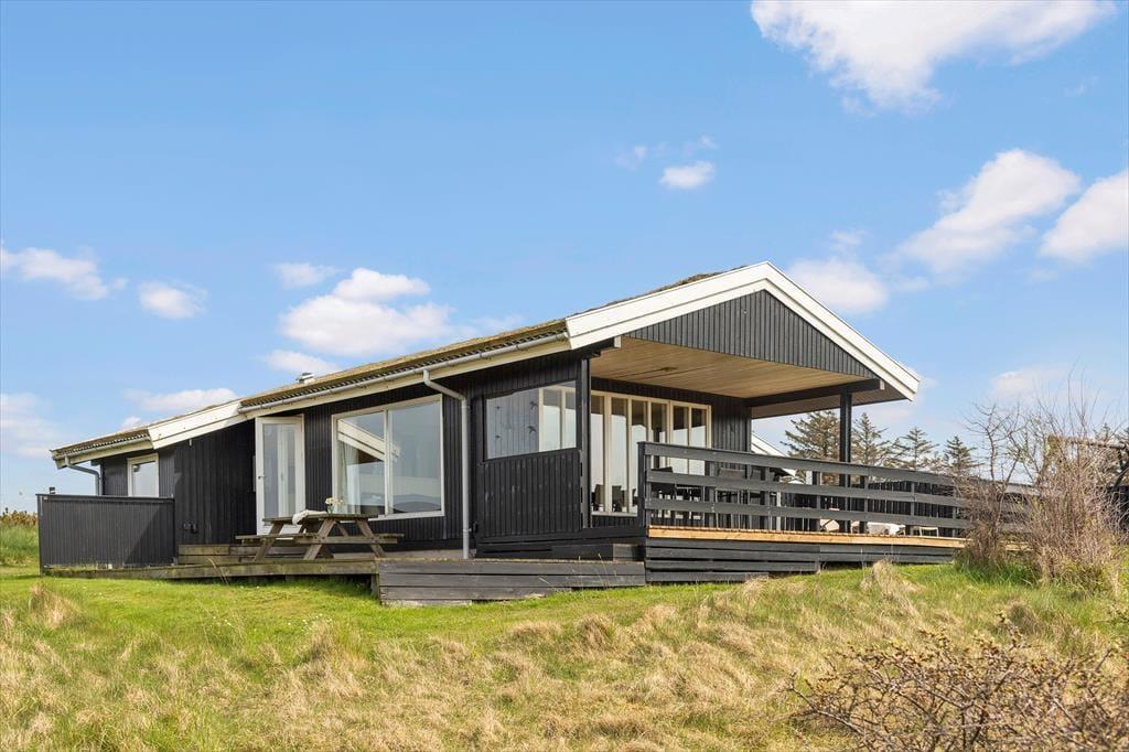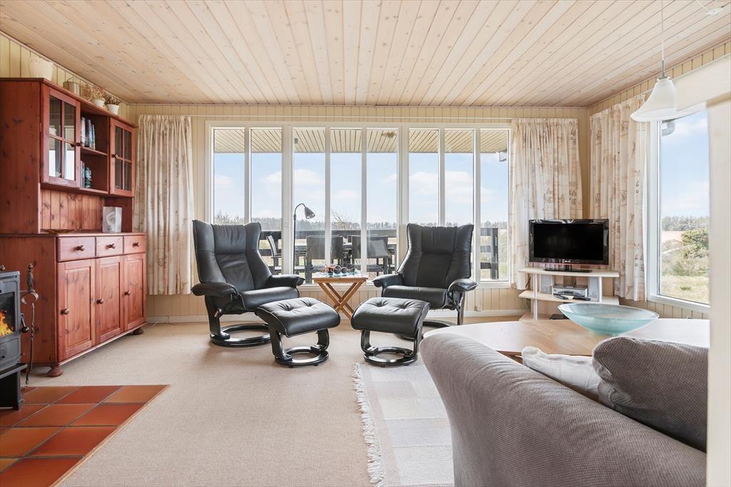 Hyggeligt og velholdt sommerhus med plads til den lille familie. Huset indeholder bl.a. køkken i åben forbindelse med stuen og to soveværelser. Det ene med dobbeltseng og et mindre værelse med køjer. Desuden findes også et anneks med dobbeltseng. Efter en skøn gåtur i det smukke naturområde, er det skønt at komme hjem til huset og tænde op i brændeovnen. Sommerhuset er indbydende og lyst på grund af de store vinduer, og overalt fra stuen og køkkenet har man den mest fantastiske udsigt, man kan forestille sig, både over området og ikke mindst over Vesterhavet.