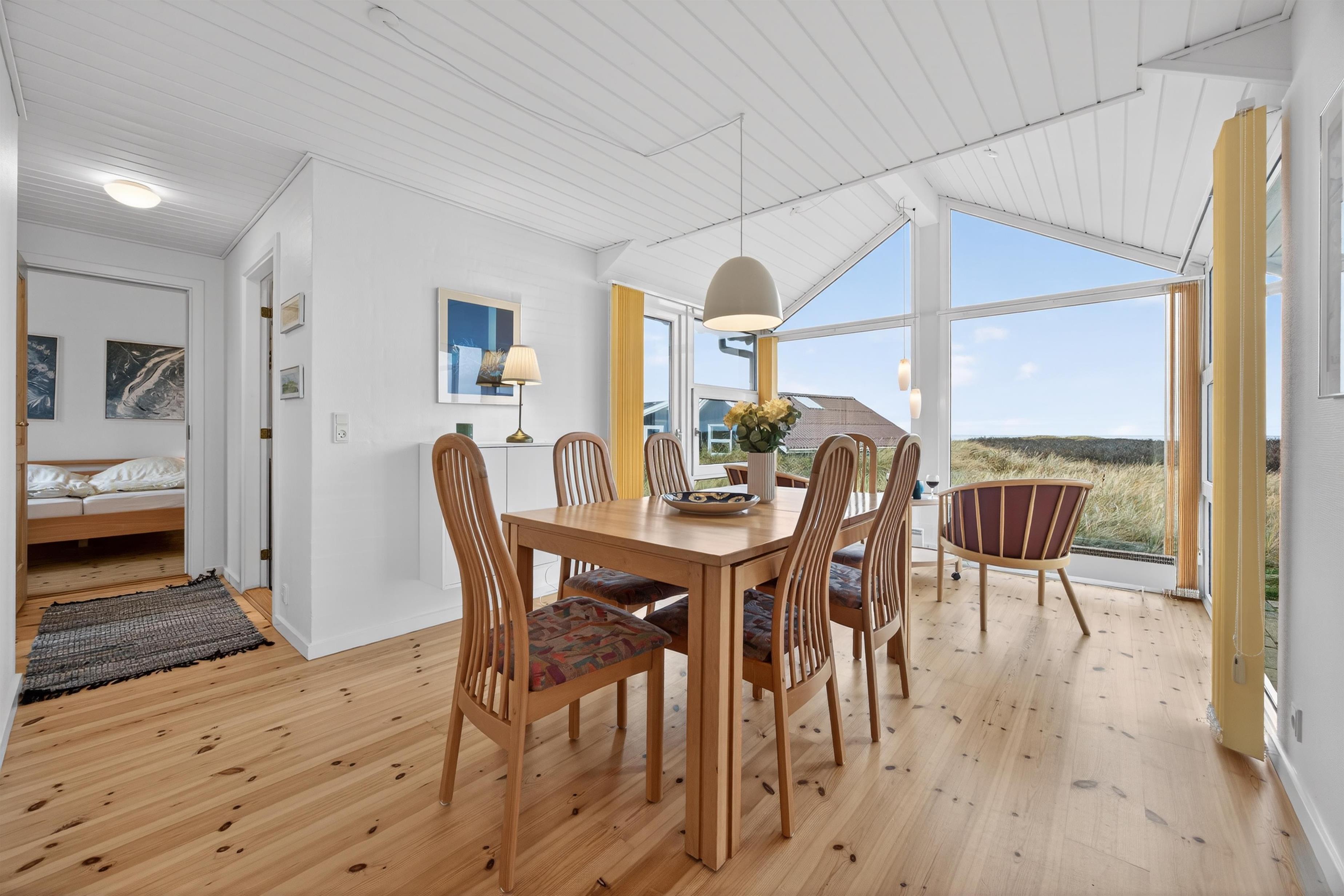 Indvendigt mødes I af et hyggeligt og funktionelt sommerhus med plads til både samvær og afslapning. Køkkenet ligger centralt i huset i åben forbindelse med de øvrige opholdsrum. Lige ved siden af køkkenet finder I den hyggelige stue, hvor man kan slappe af med en god bog, en film eller et spil. I husets anden ende ligger spisestuen, som byder på en flot udsigt over havet og danner en naturlig ramme om fælles måltider og hyggelige stunder. Brændeovnen fuldender stemningen og skaber varme og hygge på kølige aftener.