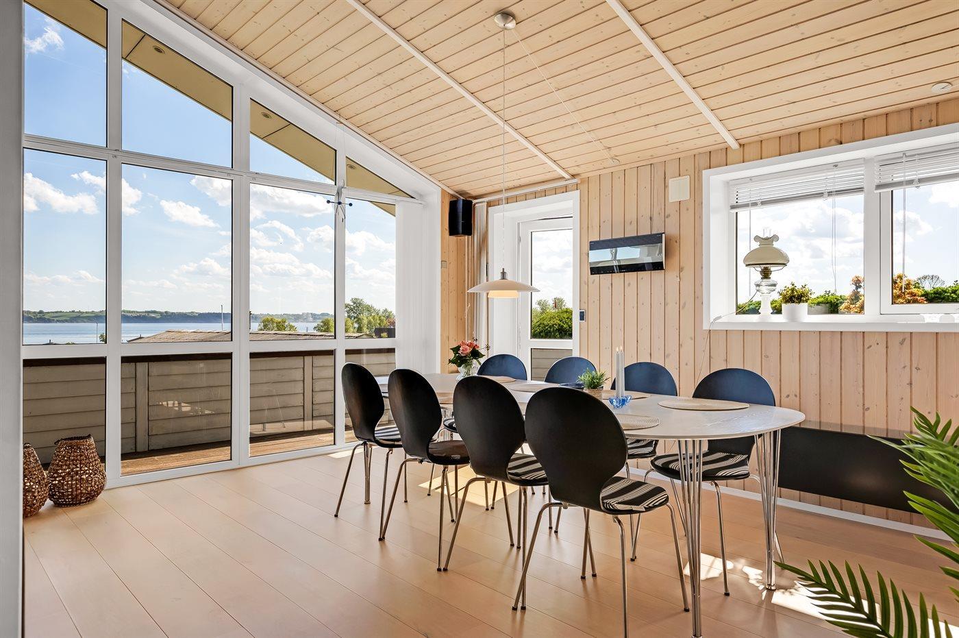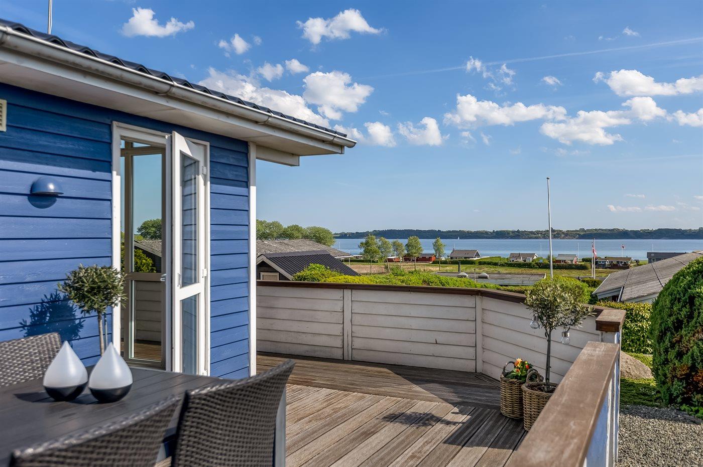 Feriehus beliggende i Skarrev og med panoramaudsigt over Aabenraa Fjord tæt ved dejlig, børnevenlig sandstrand.
