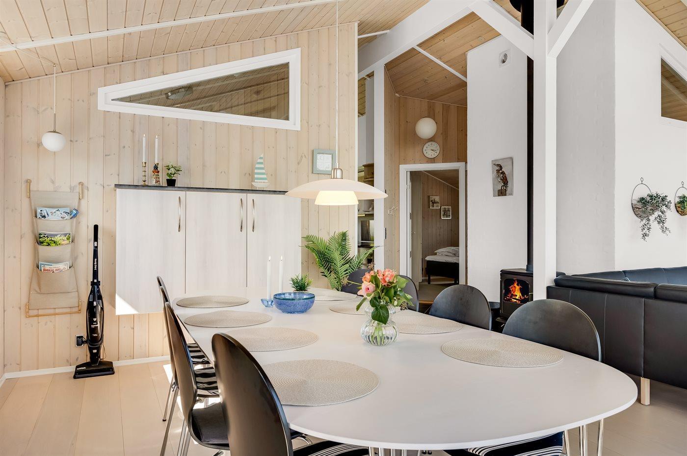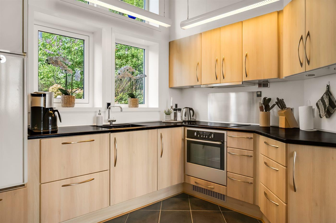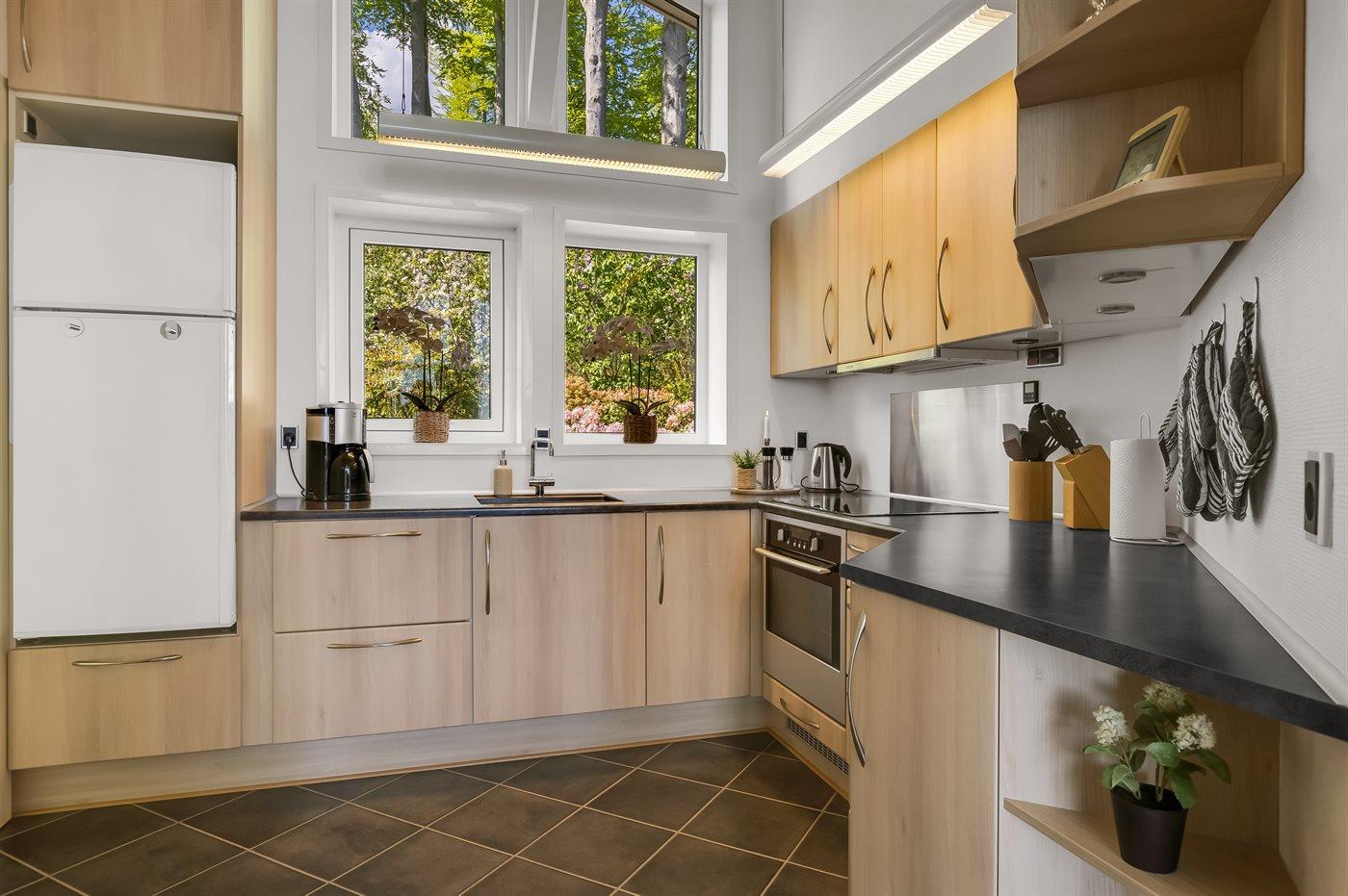 Køkkenet er udstyret med 1 køleskab. Der er 4 induktionskogeplader, varmluftovn samt opvaskemaskine.