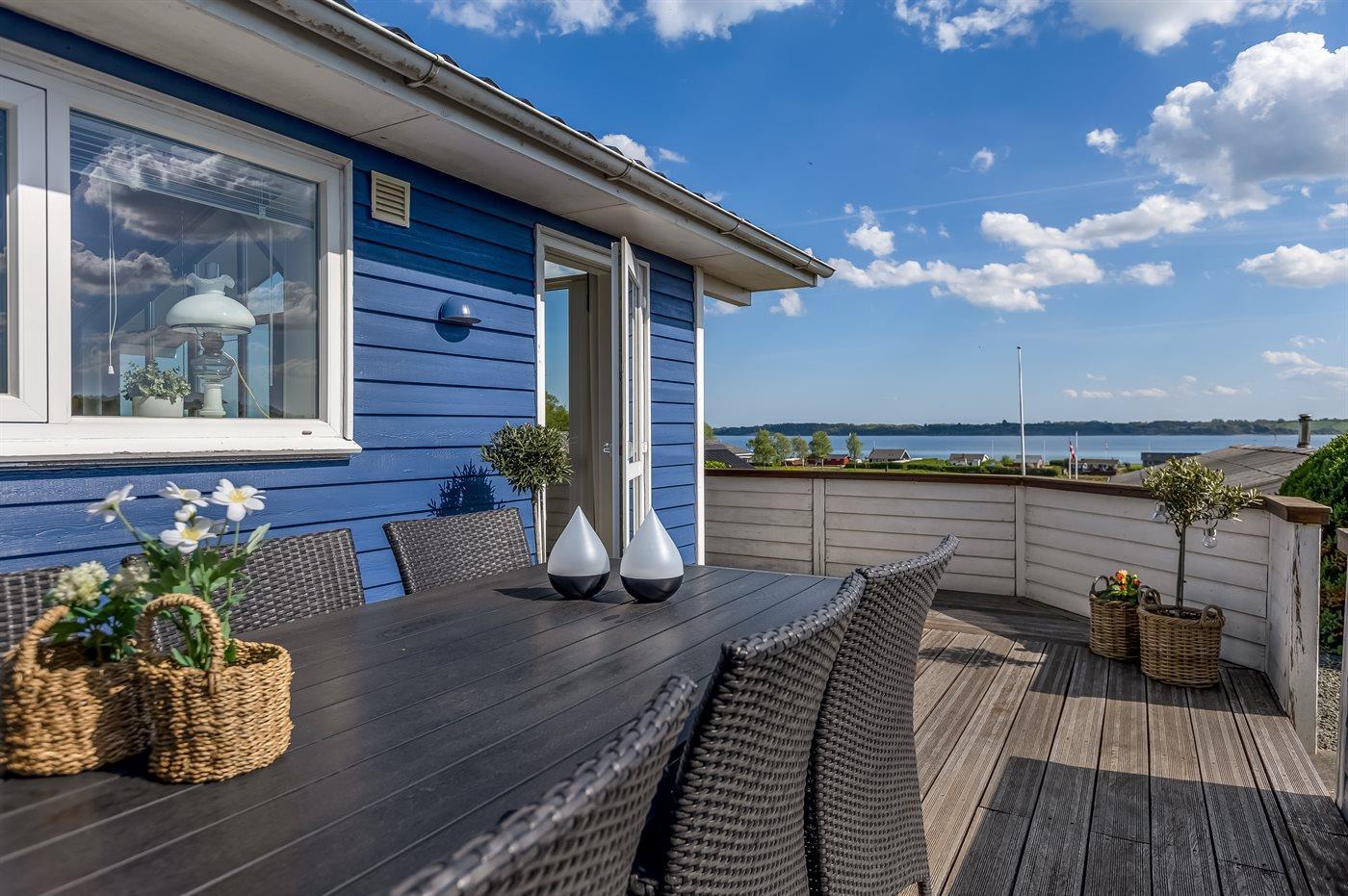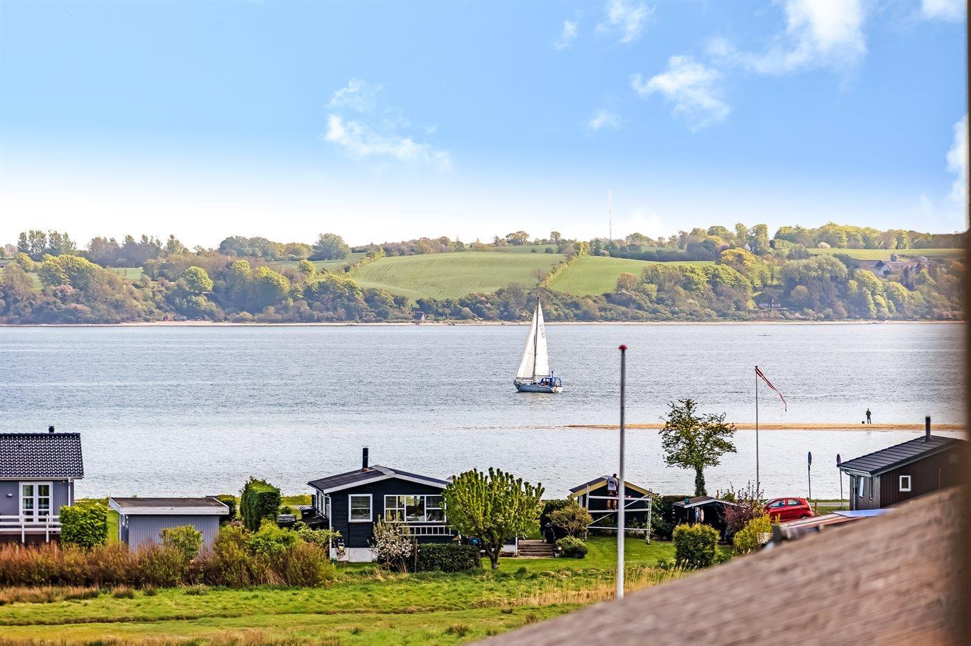 Charmerende feriehus i Skarrev med panoramaudsigt over Aabenraa Fjord og nær børnevenlig sandstrand.