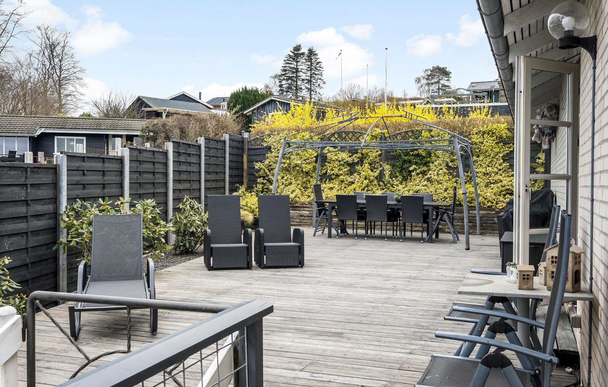 På de varme dage kan I trække ud og sætte jer godt til rette på terrassen, der er rummelig og løber rundt om flere sider huset. Find sol, skygge og læ efter behov med en god bog, mens I nyder udsigten og ser på fugle. Fra terrassen går en trappe ned i haven, hvor børnene finder god plads at boltre sig på, inden I lader dagen gå på hæld med saftige bøffer fra grillen under aftensolen.