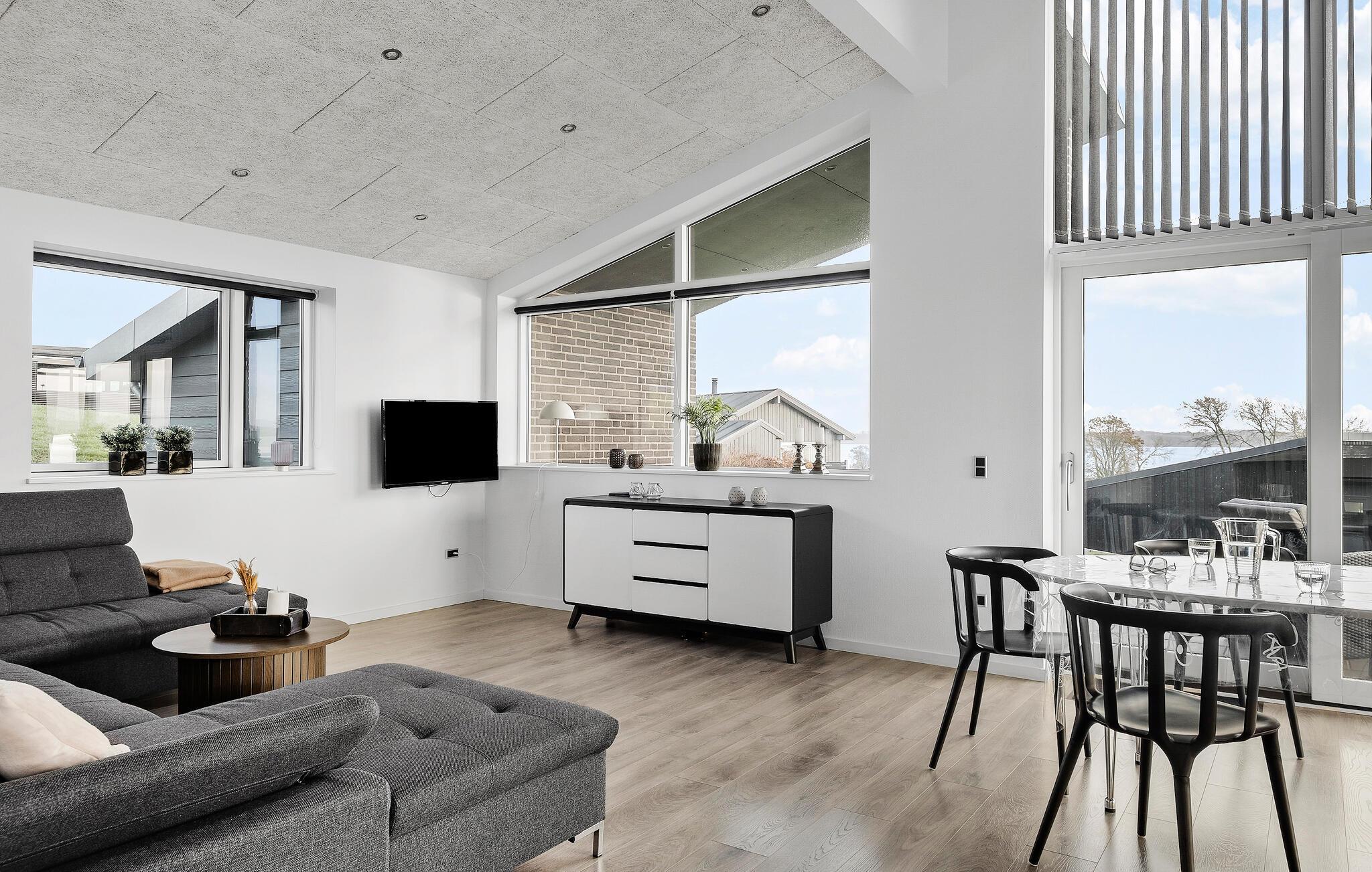 Stilfuldt feriehus ved Skarrev Strand med panoramaudsigt over Aabenraa Fjord og moderne indretning.