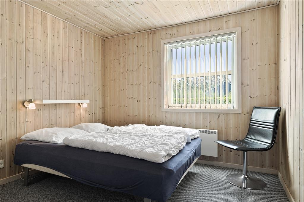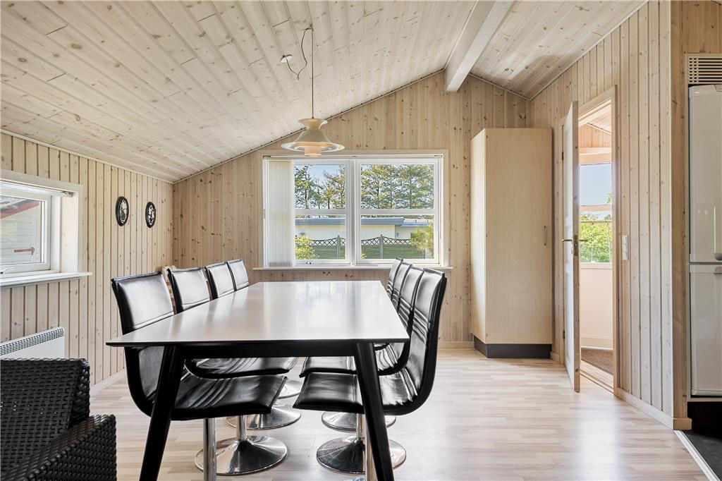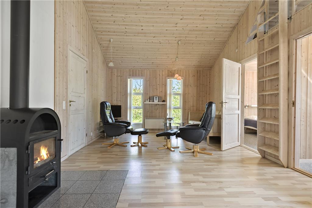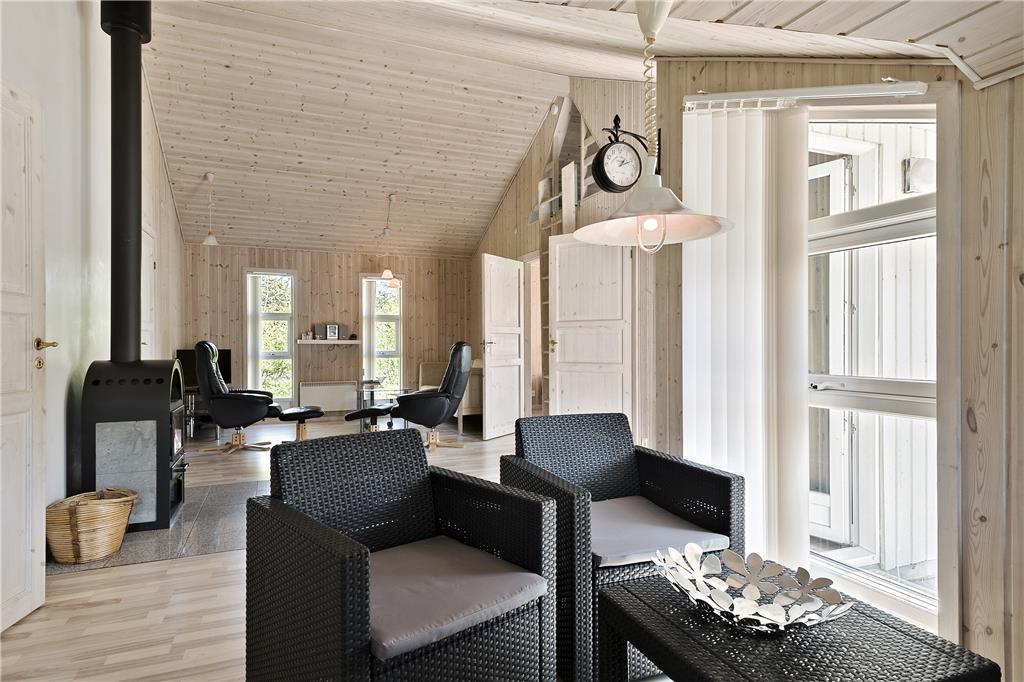 Atmosfæren er lys og indbydende inden døre i sommerhuset, der er opført i 2007 og måler 108 m2. Tre soveværelser hører med til den gennemtænkte planløsning, og derudover er der madrasser på hemsen, så otte personer nemt og bekvemt kan tilbringe feriedagene sammen. De sociale stunder kan oplagt foregå i stuen, som er et luftigt og højloftet rum med gennemstrømmende lysindfald, brændeovn, spisebord og komfortable siddemøbler. Køkkenet er på praktisk vis integreret med stuen, så når det er ved at være tid til at forberede aftensmaden, kan I stadig tage del i det hyggelige selskab. Skal der virkelig slappes af, kan I forkæle jer selv med en tur i saunaen, der ligger på det store og velindrettede badeværelse.