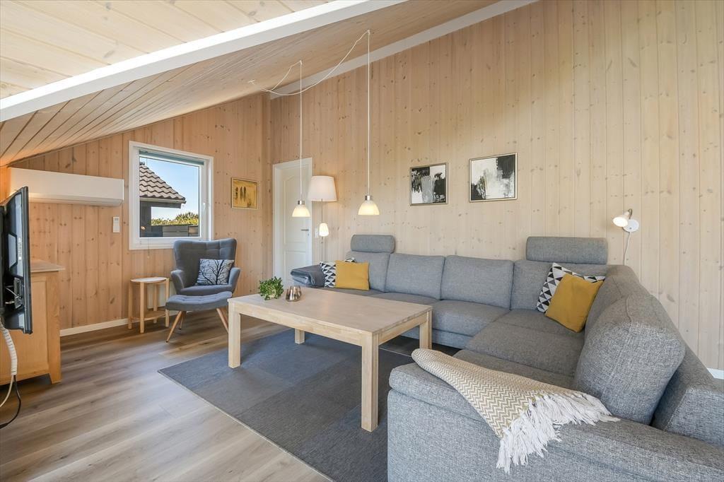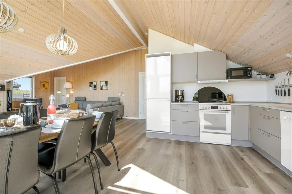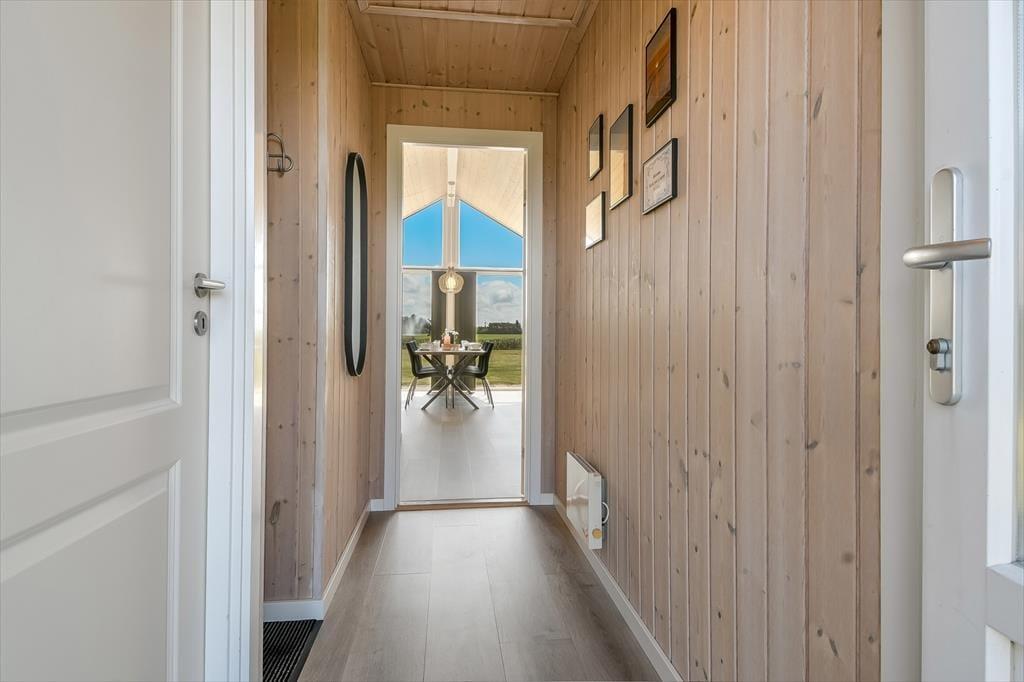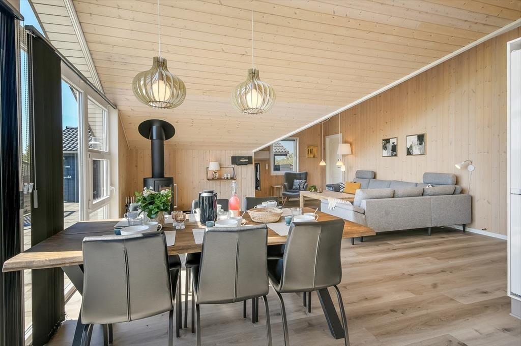 Det smukke marklandskab bliver inviteret helt indenfor i stuen af det store sydvendte gavlvindue, der også sørger for et glimrende lysindfald. Spisebordet er placeret lige ved vinduet, og også når du skal lave mad i det åbne køkken, kan du stå og hygge dig i en solstråle, mens du hører musik eller vender dagens oplevelser med familien. På en kølig dag kan du tænde op i brændeovnen, og et varmt spabad på badeværelset er også en dejlig måde at slappe af inden døre. Og når det er tid til at sige godnat, har du og dine kære tre gode soveværelser at fordele jer på.