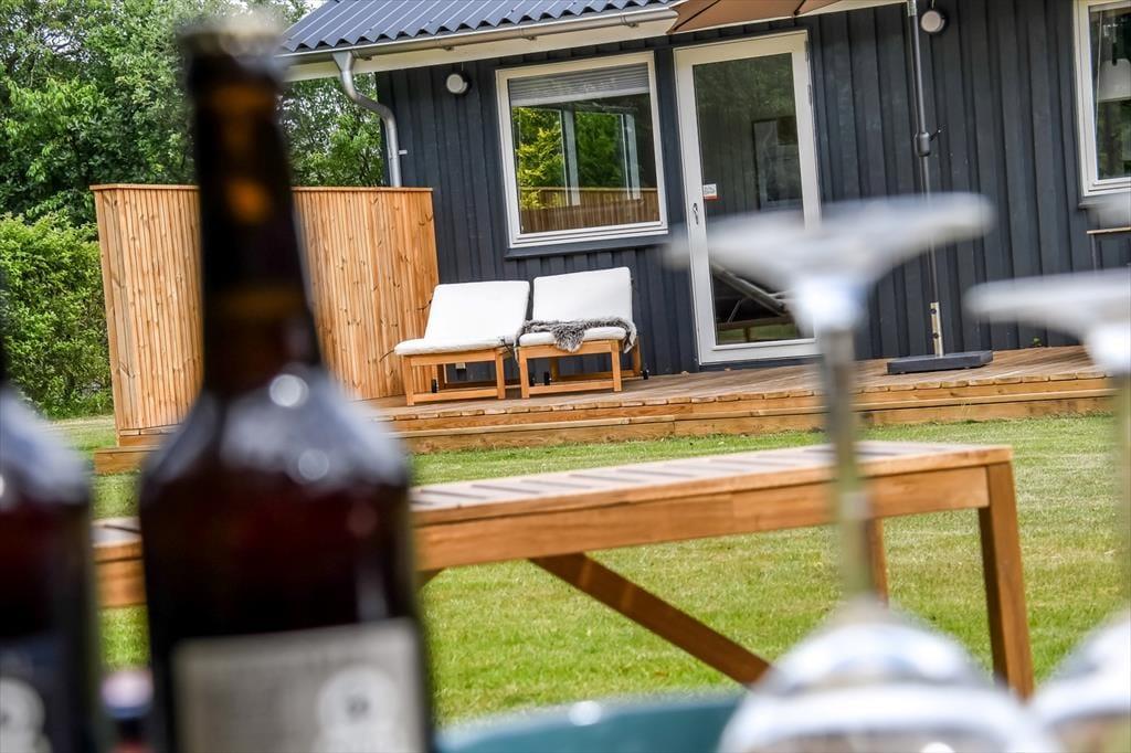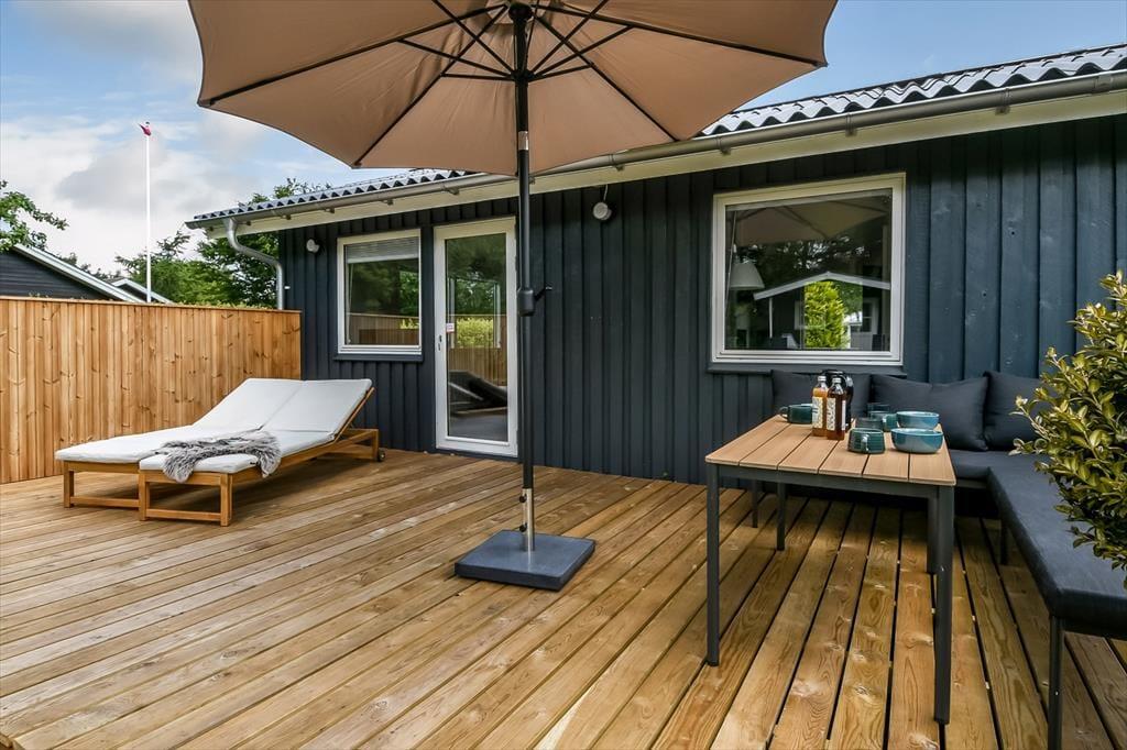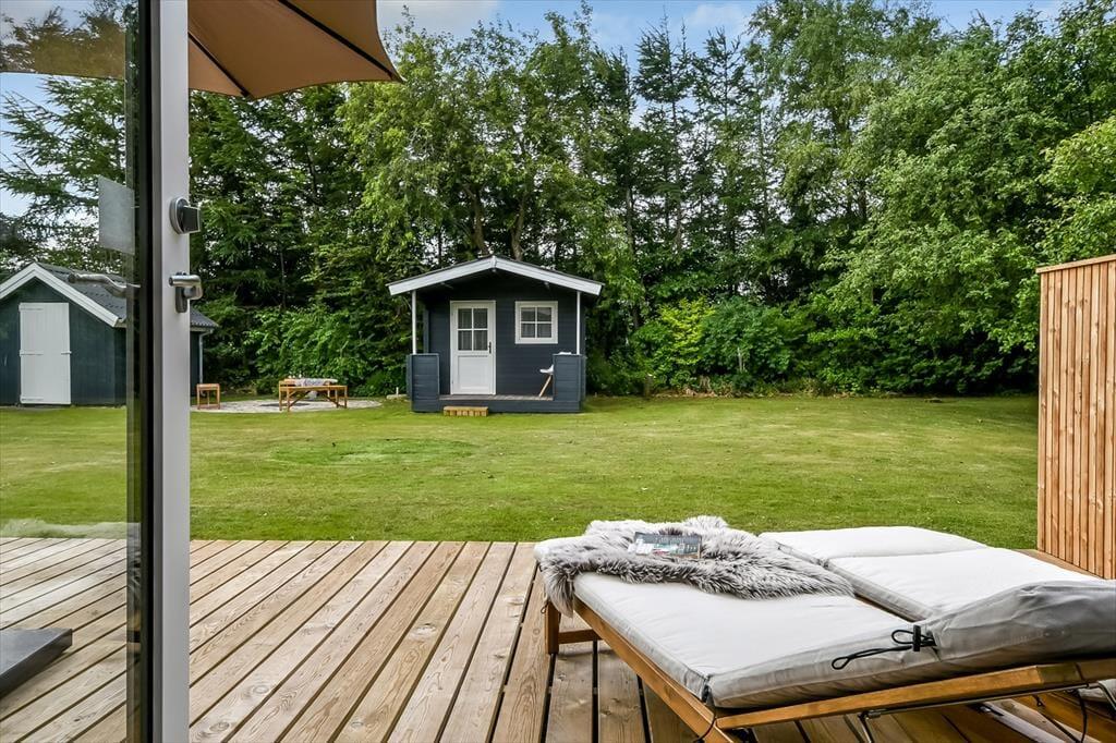 Udenfor fortsætter stemningen i samme afslappede stil. Grunden er omkranset af høje træer og tætte buske, så du kan nyde privatlivet, mens solen varmer terrassen og fuglene kvidrer i trækronerne. Her kan du tage morgenkaffen med udenfor i nattøj og bare tæer – eller finde skumfiduserne frem og tænde op i bålstedet, når solen går ned, og himlen farves orange bag trætoppene. Der er masser af plads til at slappe af i solen eller lege i det grønne græs, og du vil hurtigt opleve, hvordan hverdagens travlhed fordufter, mens du finder din egen rytme mellem havestolene og den friske fjordluft.