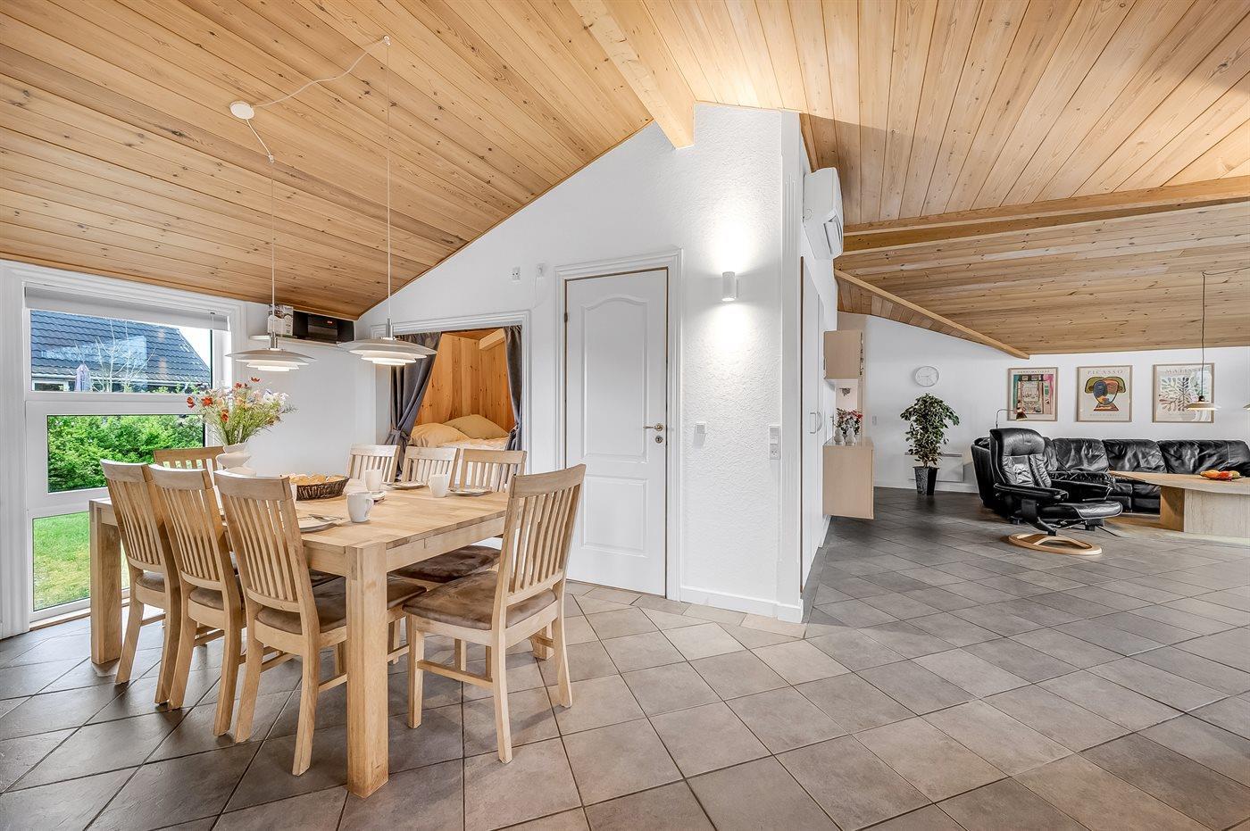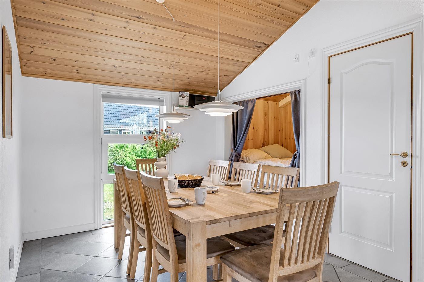 Midtpunktet i dette rummelige sommerhus er det store køkken-alrum, hvor sollyset strømmer ind af det store vinduesparti. Her kan du hygge dig i sofaen med en god bog og med brændeovnens knitren i baggrunden. Der er også mulighed for fælles hygge med et brætspil ved det store spisebord. Ved siden af spisebordet finder du den hyggelige alkove – her er det muligt at trække sig lidt tilbage samtidig med, at man stadig er en del af fællesskabet.