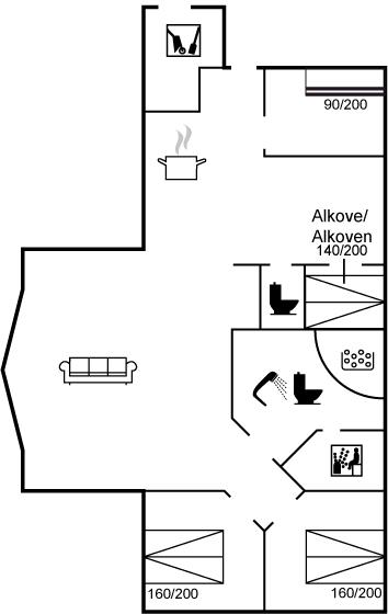 Der er i alt 3 soveværelser. Sovepladserne fordeler sig på: 4 sovepladser i dobbeltsenge. 2 sovepladser i køjeseng. 2 sovepladser i alkove. Derudover er der 1 stk. barneseng.
