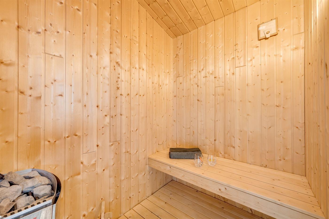 Der er 2 badeværelser med bruseniche og 2 toiletter. Der er gulvvarme på 2 badeværelser. I saunaen er der mulighed for afslapning.