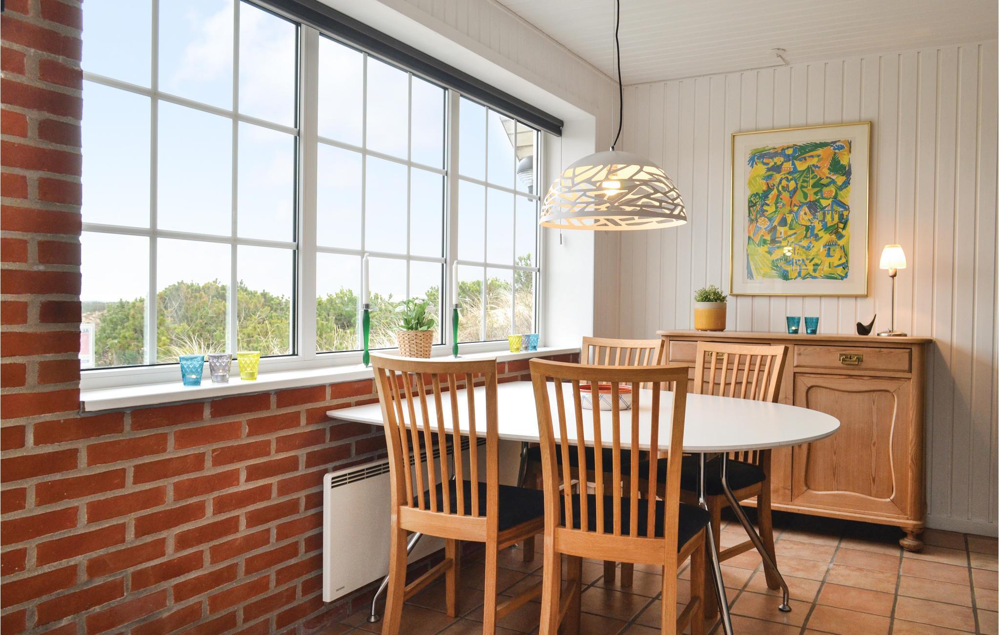 Charmerende sommerhus beliggende på toppen af en klit med en fantastisk udsigt over Ringkøbing Fjord. Nyd morgenkaffen og solopgangen fra den skønne spisekrog - udsigten bliver ikke bedre. Huset er lyst og hyggeligt indrettet med køkken og stue i sammenhæng med hinanden, her nydes gode måltider eller afslapning foran pejsens knitren. De to dejlige soveværelser er hyggeligt indrettet og i badeværelset er vaskemaskinen installeret. Desuden et ekstra lille depotrum til fodtøj og overtøj. Sommerdagene nydes fra terrassen, hvor der er en forrygende udsigt over fjorden, klitter og landskabet. Huset ligger på en klittop, og I skal via en trappe, for at komme op til huset - bilen kan parkeres nedenfor trappen.