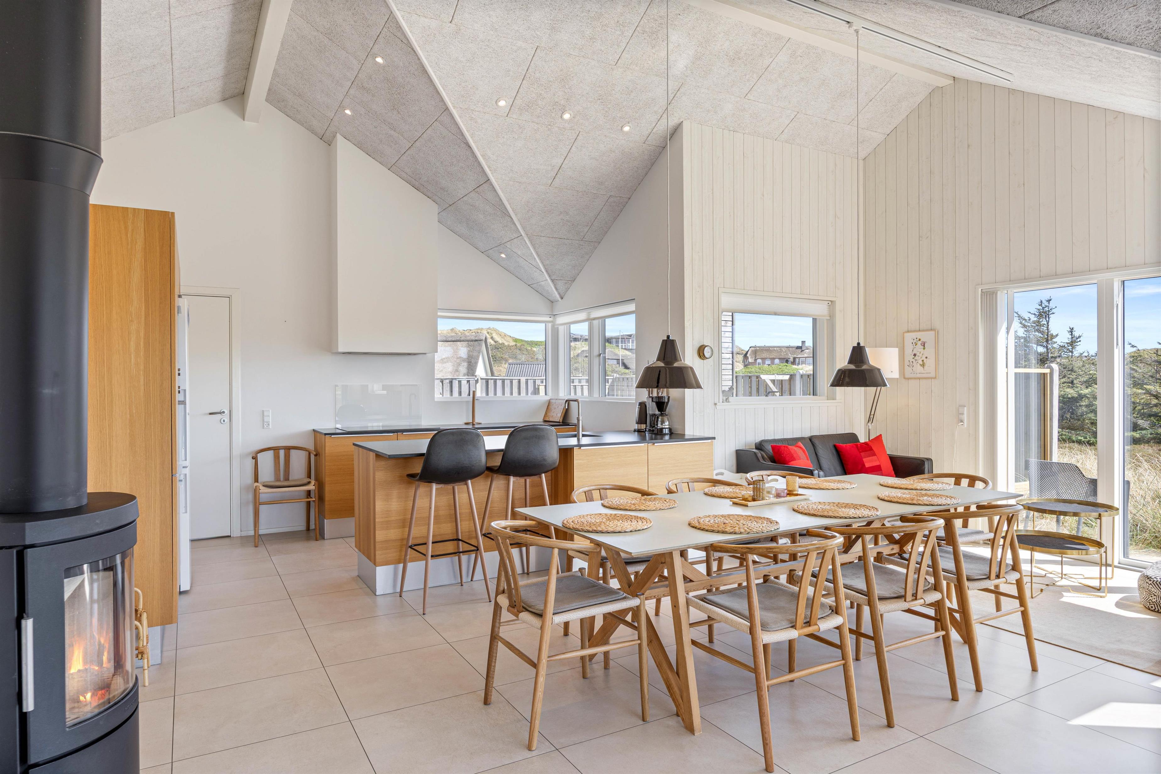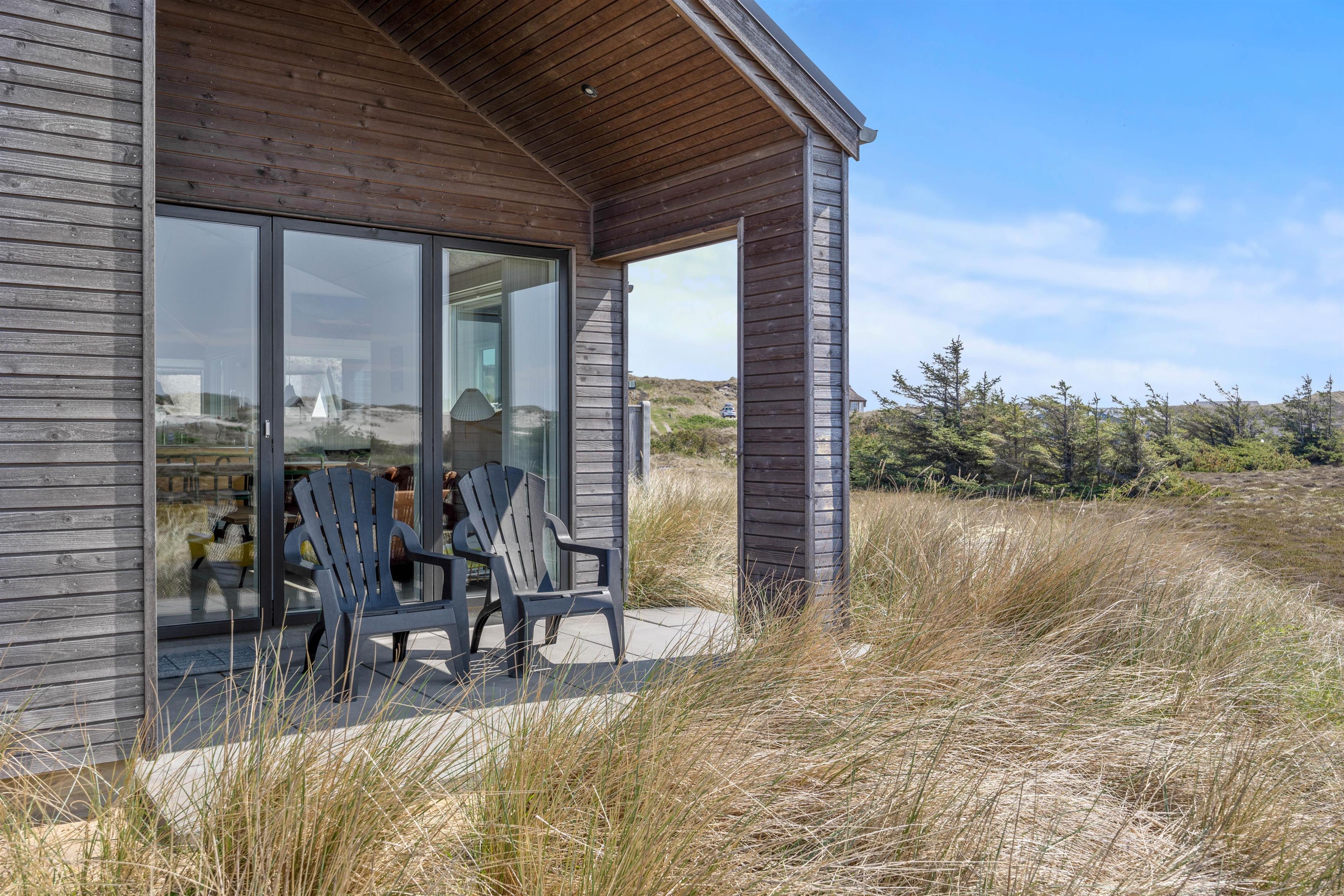 Det femstjernede feriehus i Skodbjerge er først opført i 2019. Lyse vægge og lofter indrammer de velindrettede rum, og store vinduespartier sørger for et skønt lysindfald - og ikke mindst et godt udsyn til den omkringliggende natur.