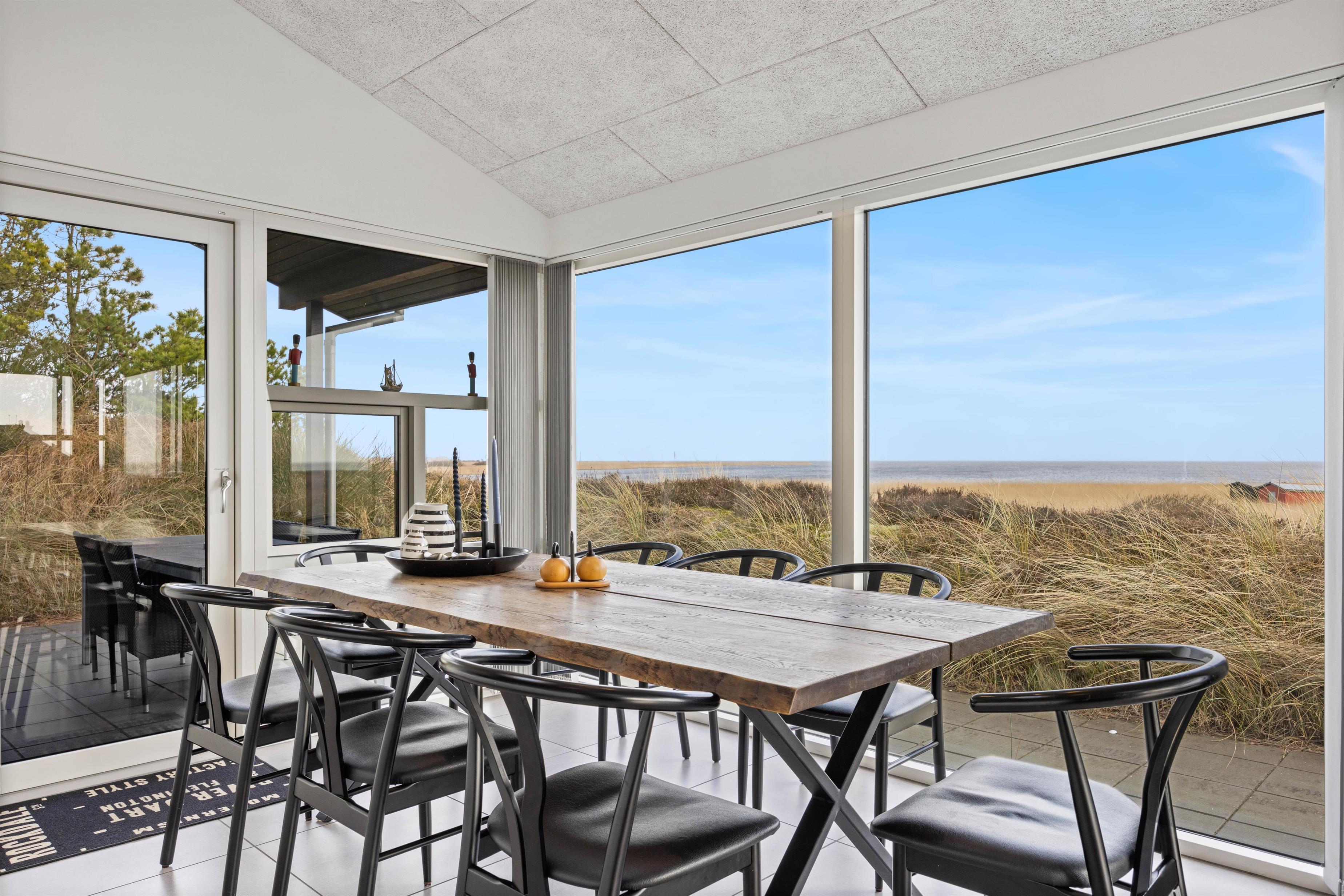 Feriehusets beliggenhed er helt unik, og I får en enestående panoramaudsigt til Ringkøbing Fjord fra stuen såvel som fra den store terrasse, der løber hele vejen rundt om huset. Her får I både en overdækket og åben del, som er godt afskærmet af grantræerne og gør de gode terrassedage helt ugenerede.