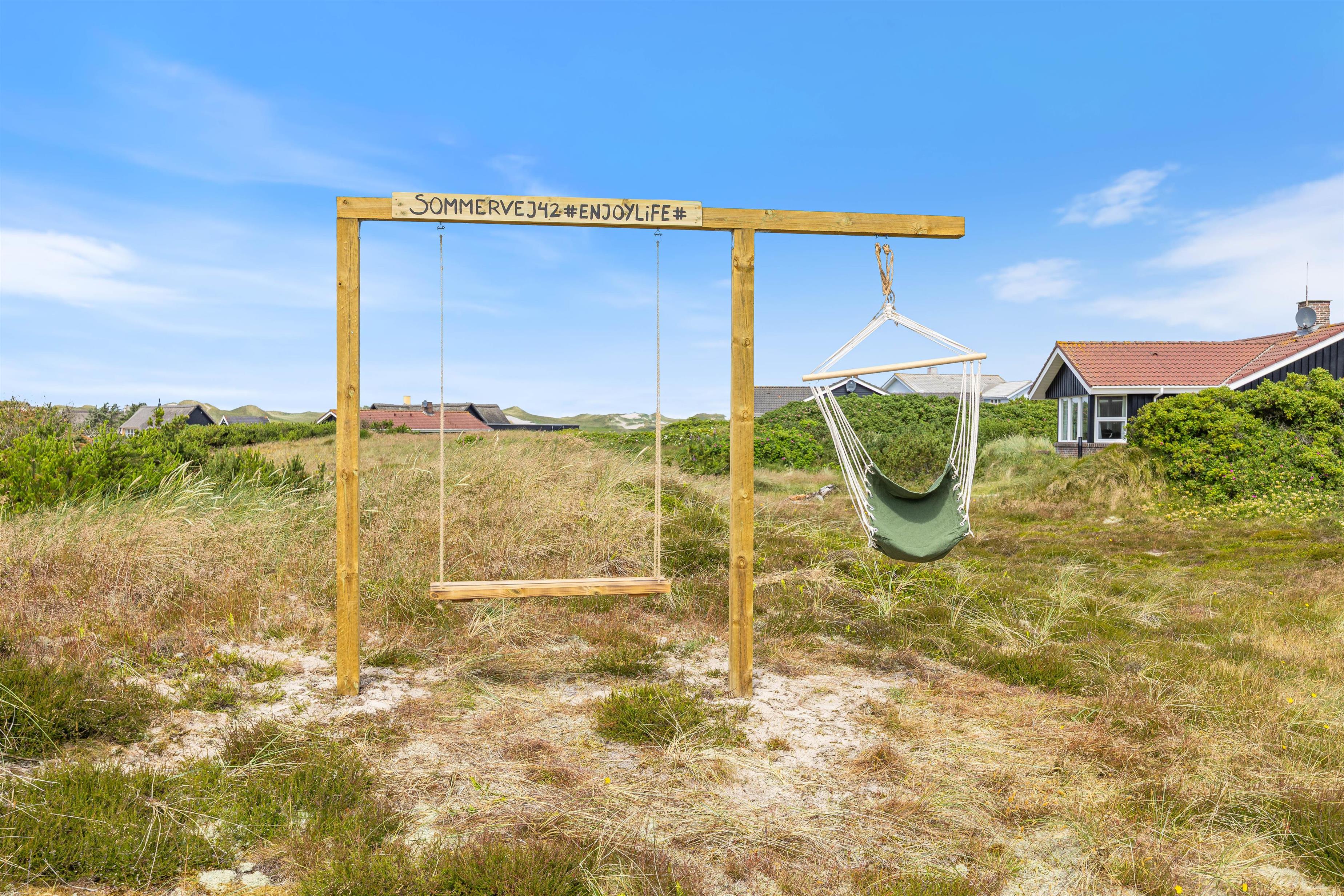 Når vejret tillader det, indbyder den lukkede og afskærmede terrasse til afslapning i rolige omgivelser. Her kan I nyde dagens første kop kaffe, læne jer tilbage i solen eller bare lade tankerne flyve i den friske vestjyske luft. Imens kan børnene lege trygt på gyngen, der er placeret på grunden.