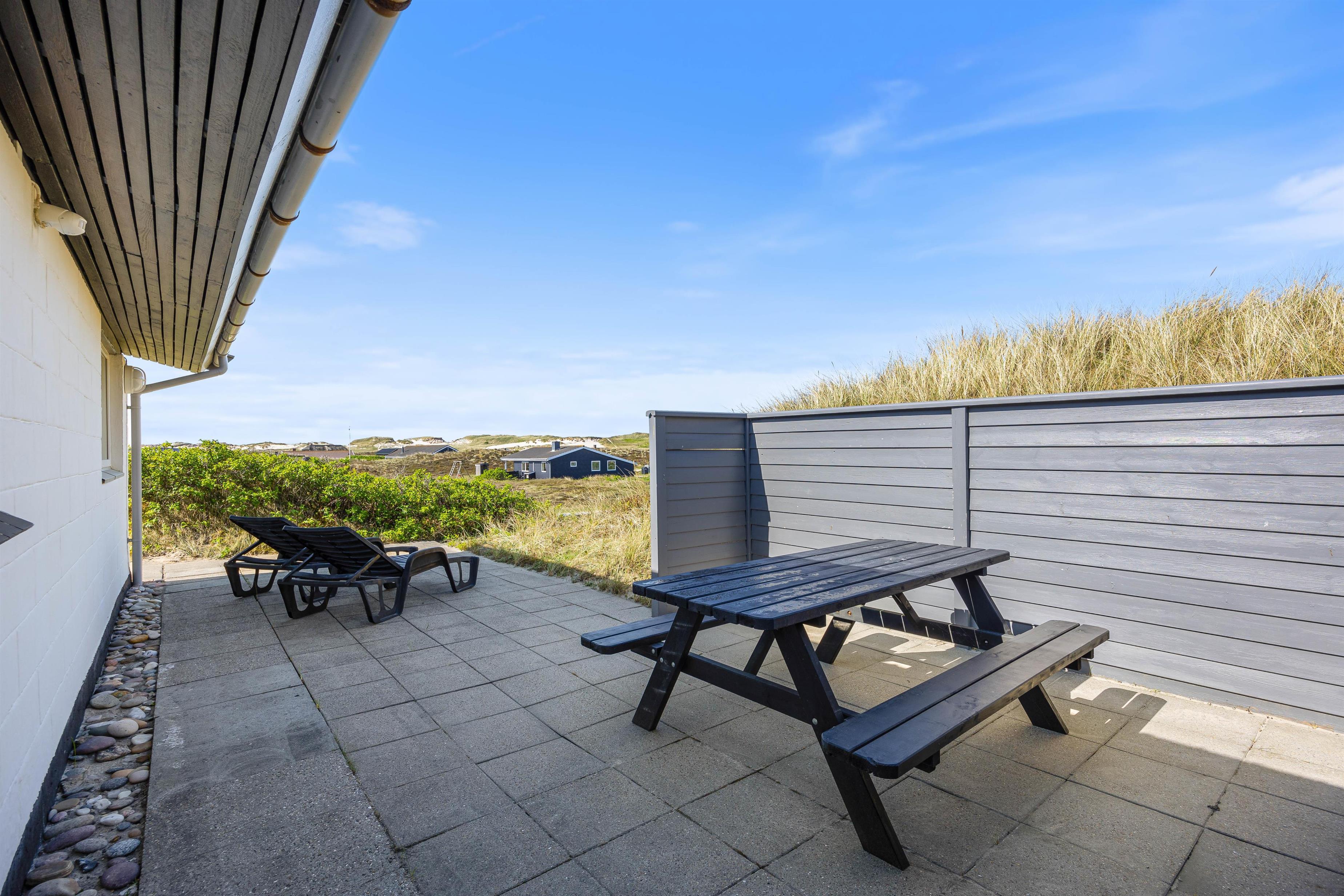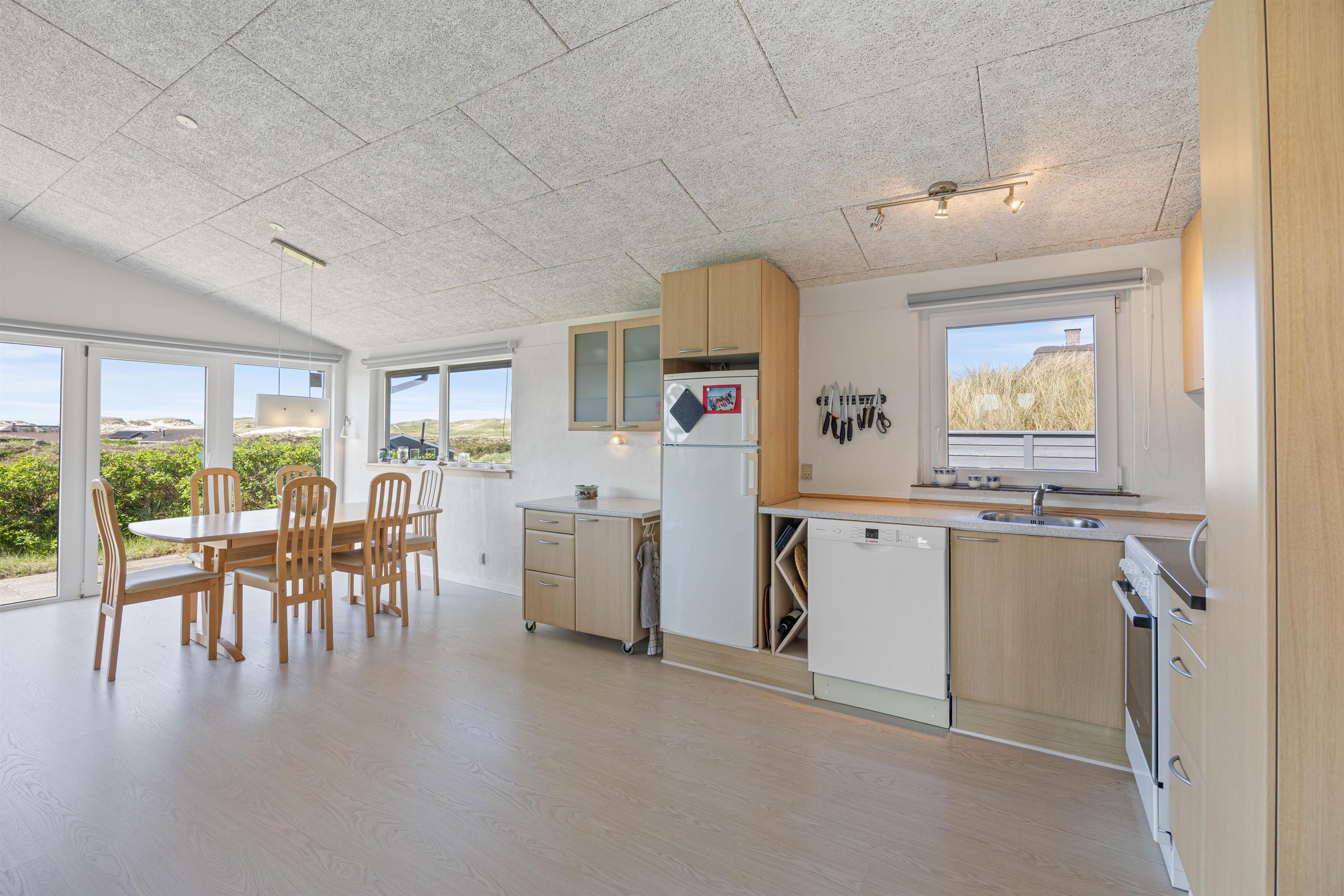 Sæt jer til rette i sofagruppen ved det brede vinduesparti og nyd udsigten over klitlandskabet. Luft til luft varmepumpen sørger for, at temperaturen altid er behagelig. Træk jer tilbage med en god bog, tænd eventuelt op i brændeovnen og lad feriestemningen brede sig.