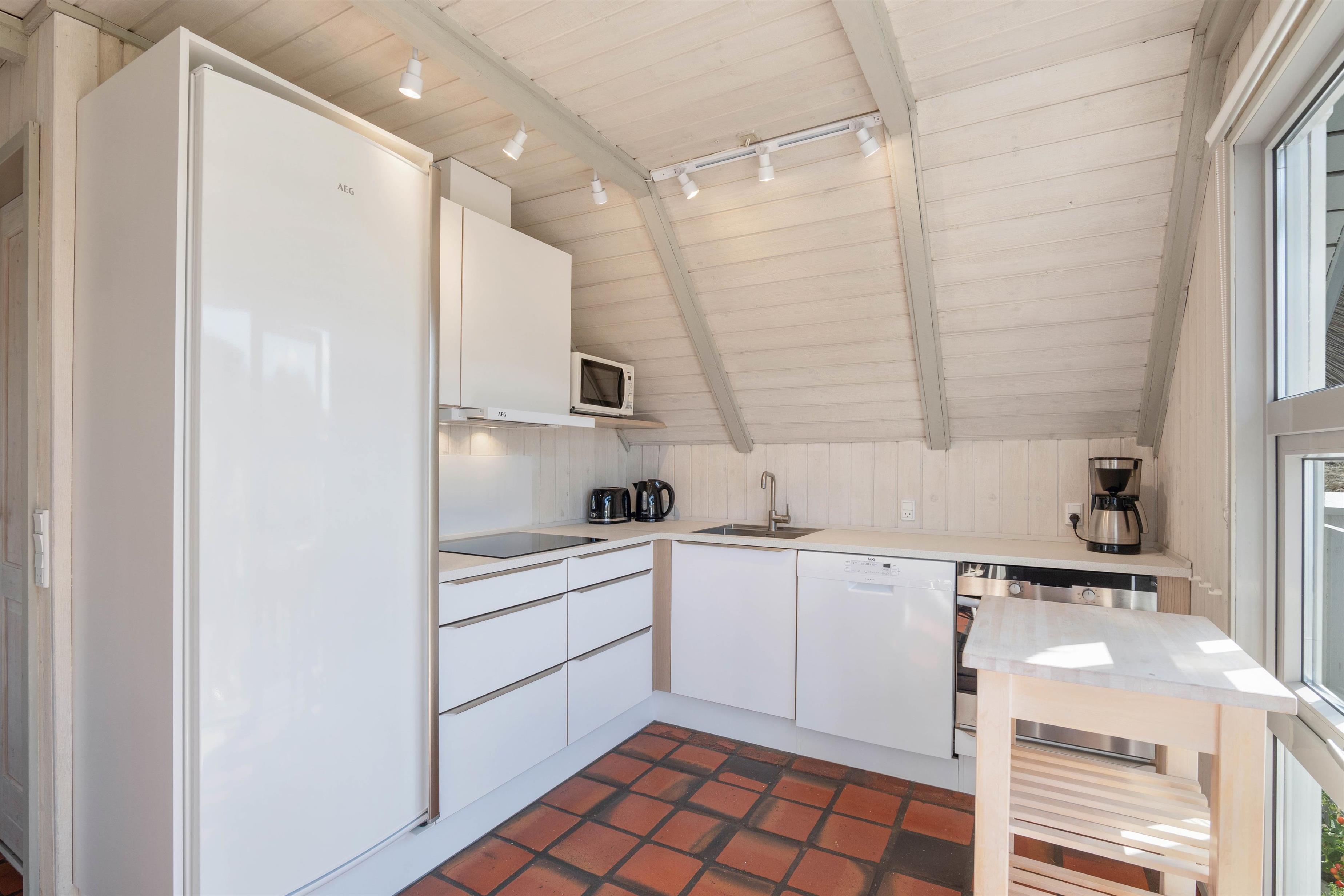 Her er en hyggelig stue med klinkegulve med gulvvarme, skønne og behagelige møbler og ikke mindst pragtfuld udsigt over heden og til klitterne. Stuen står i åben forbindelse med køkkenet, som er praktisk indrettet med bl.a. opvaskemaskine. Fra køkkenet er der udgang til en skøn øst- og sydvendt terrasse med masser af læ på en blæsende dag.
