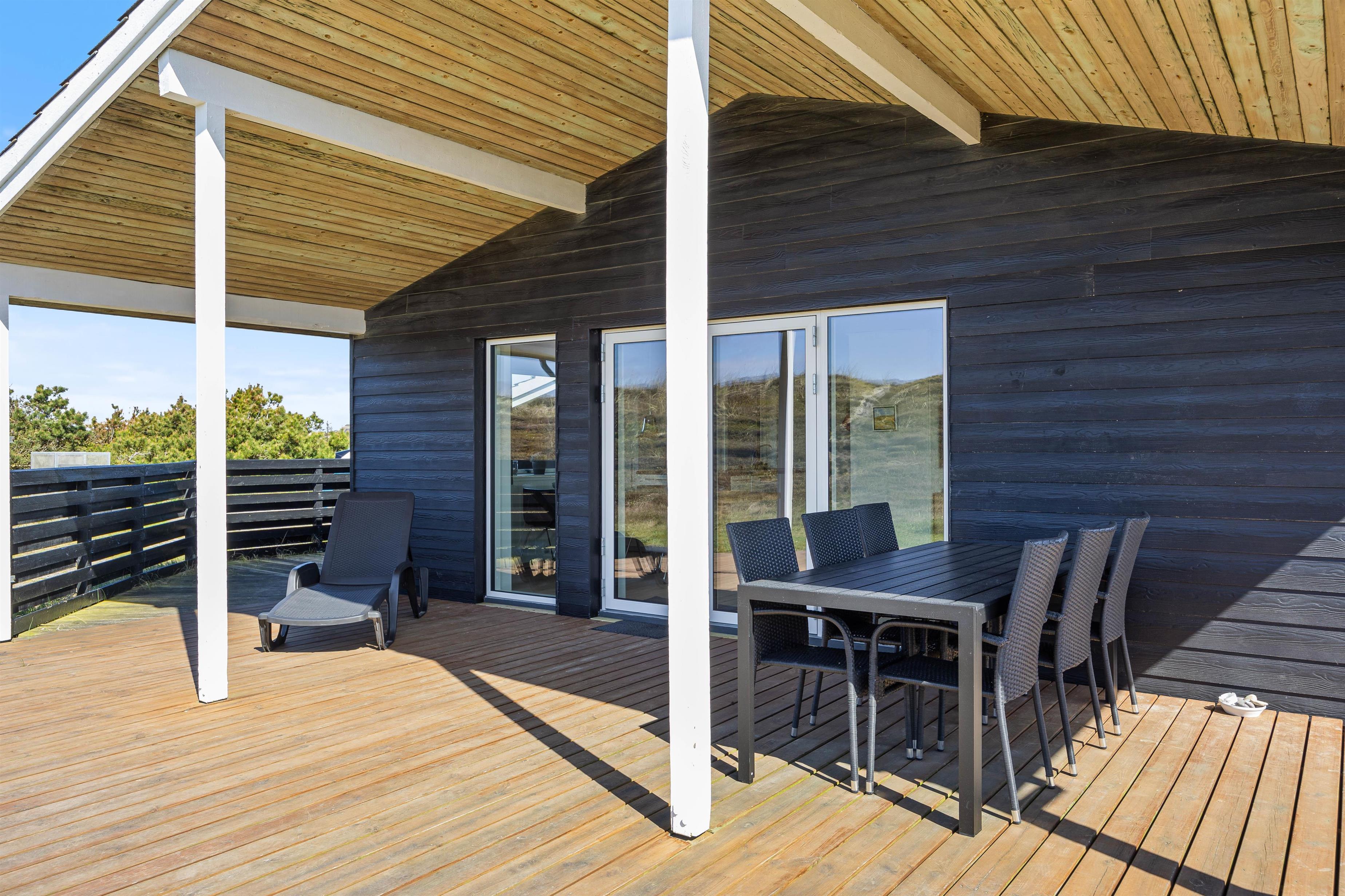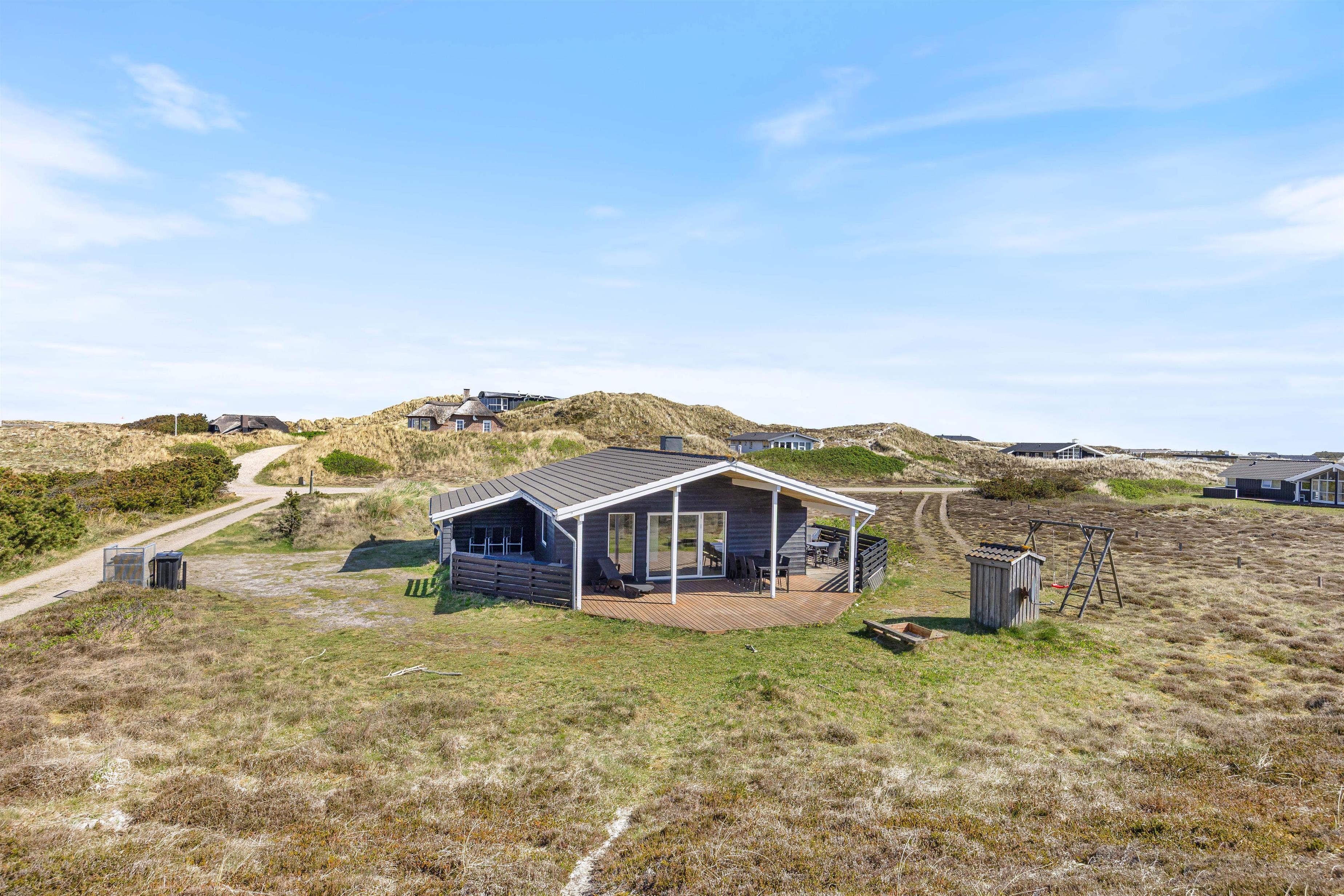 Den store delvis overdækkede terrasse giver jer mulighed for at sidde på begge sider af huset. Derved kan I altid finde det helt perfekte læ-sted, hvor I kan nyde solen og den fantastiske udsigt ud over klitlandskabet. På grunden er der både sandkasse og gynger til de mindste. En perfekt afslutning på en skøn feriedag kan være en hyggelig og veltilberedt grillmiddag på terrassen – imens I ser solen gå ned bag klitterne og farve himmelen purpurrød.