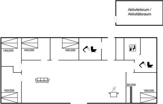 Der er i alt 5 soveværelser. Sovepladserne fordeler sig på: 10 sovepladser i dobbeltsenge. 2 sovepladser i køjeseng.2 af disse sovepladser befinder sig i et anneks.