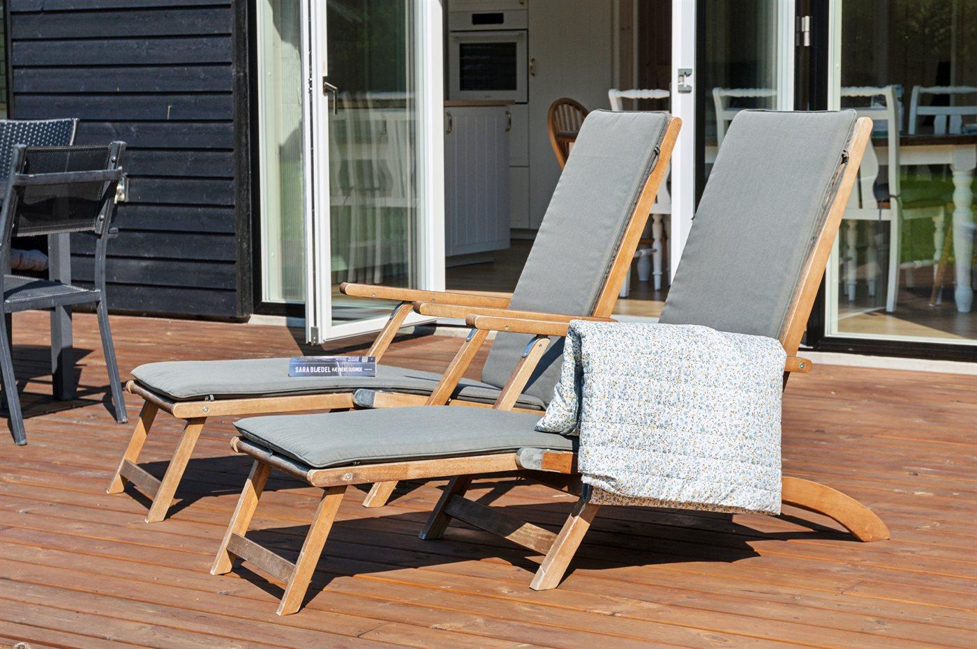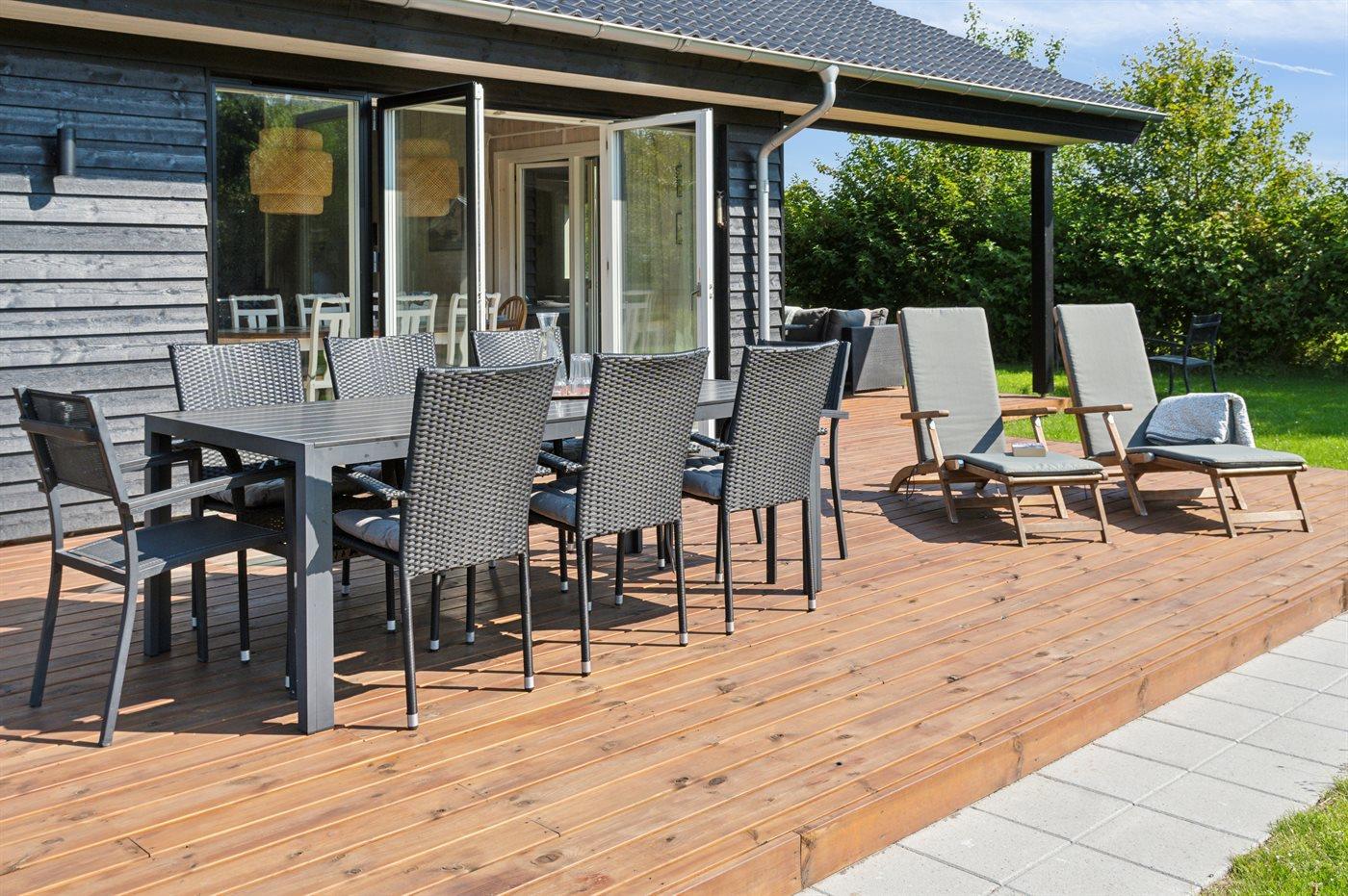 Ferieboligen er beliggende på en 1250 m² stor havegrund. Der er 600 m til havet. Nærmeste forretning er beliggende i en afstand af 1200 m. Der er en golfbane i en afstand af 10000 m. Desuden er der 16 m² overdækket terrasse. Til ferieboligen hører åbent terrasseareal. Gynge. Sandkasse. Rutchebane. Udendørs sauna. Udendørs bruser. Der er installeret stik til opladning af elbil. Type 2 stik. Med 11 kW ladeeffekt. Parkering ved ferieboligen.