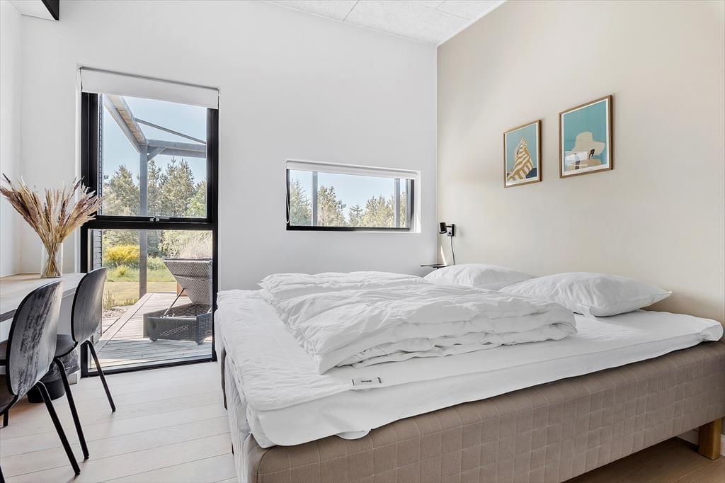 Sommerhuset er et flot byggeri fra 2021 med sortmalet træfacade og fladt tag. I forlængelse af bygningen ligger garagen, der fører jer ind til husets entré. Inden døre har rummene samme enkle elegance, og med lyse farvetoner, store vinduespartier og gulvvarme overalt er atmosfæren let og indbydende. I opholdsafdelingen er planløsningen åben, så I rigtig kan få glæde af det smukke, gennemstrømmende lysindfald, pejsens levende ild og hinandens gode selskab. Det moderne køkken er udstyret med alskens faciliteter – inklusiv en quooker, der leverer kogende vand på ingen tid – og ved sofaen hænger en stor fladskærm med kabel-tv og Chromecast. På det største af husets to badeværelser står et badekar, og på alle fire soveværelser fortsætter den minimalistiske og lækre indretningsstil.