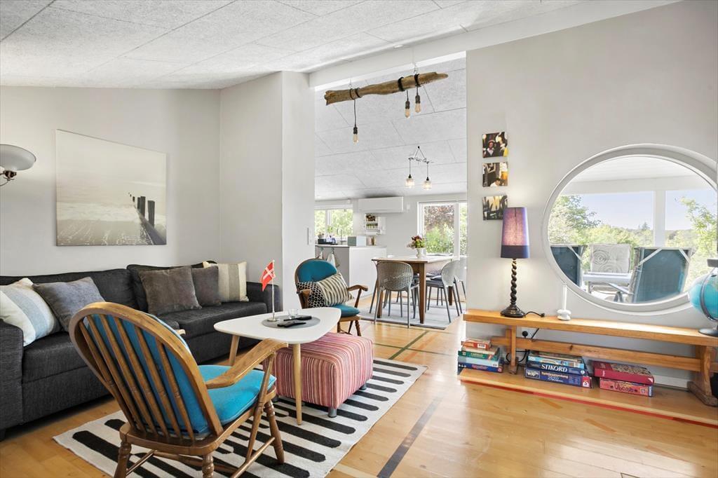 Der findes mange typehuse i det danske sommerland, men ikke på Perikumvej 72. Her finder I nemlig et originalt og charmerende feriehus, der er bygget med hjertet. For eksempel er der en niche i muren i køkkenet, der er skabt specielt til et antikt skab – og hvis trægulvets afmærkninger vækker minder om svedbånd og håndbolde, er det fordi, det er det gamle gulv fra sportshallen i Trekroner. En anden fin detalje er husets runde vinduer, der ligner koøjer og passer glimrende til et hus tæt på Vesterhavet og Slettestrand. Planløsningen passer godt til seks personer, for der er tre soveværelser at gøre godt med foruden et brusebadeværelse og et bryggersareal i gangen. Stue og køkken ligger i åben forbindelse, og med akustiklofter i kiploftet, brændeovn og komfortabelt møblement er det et herligt sted at slappe af og hygge sig sammen.